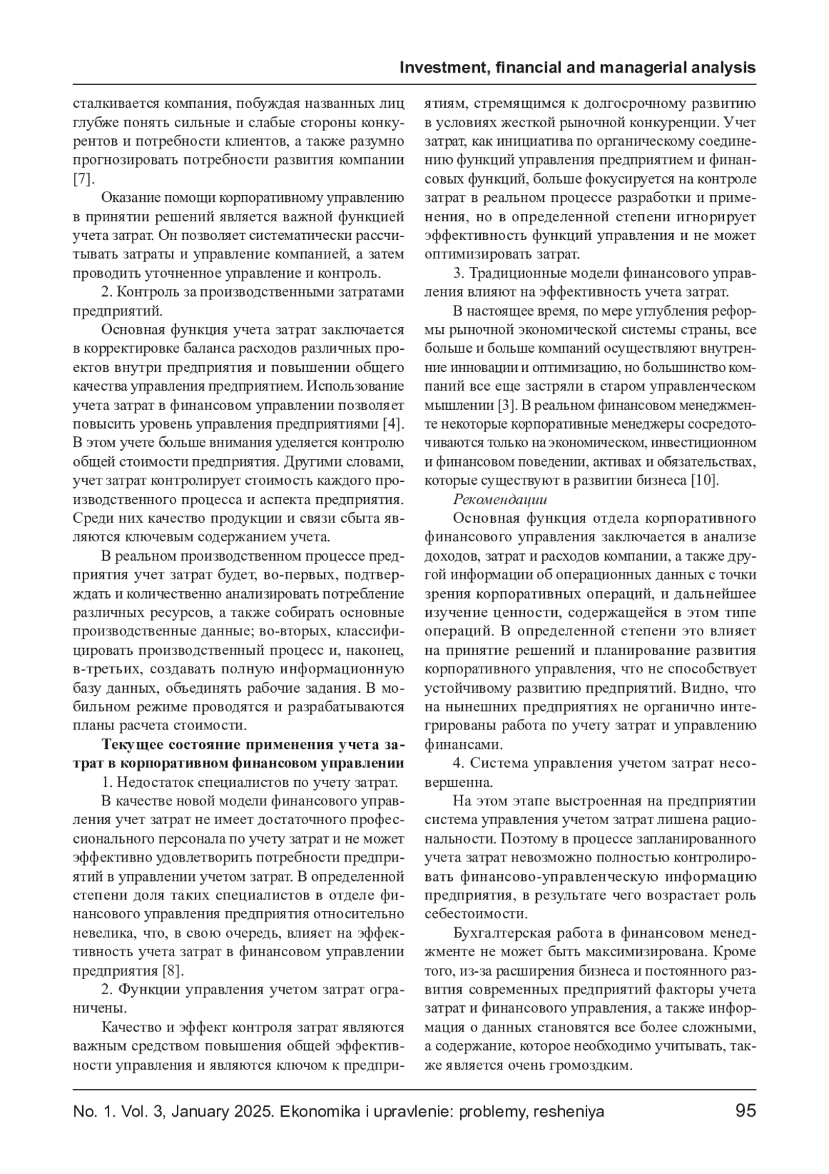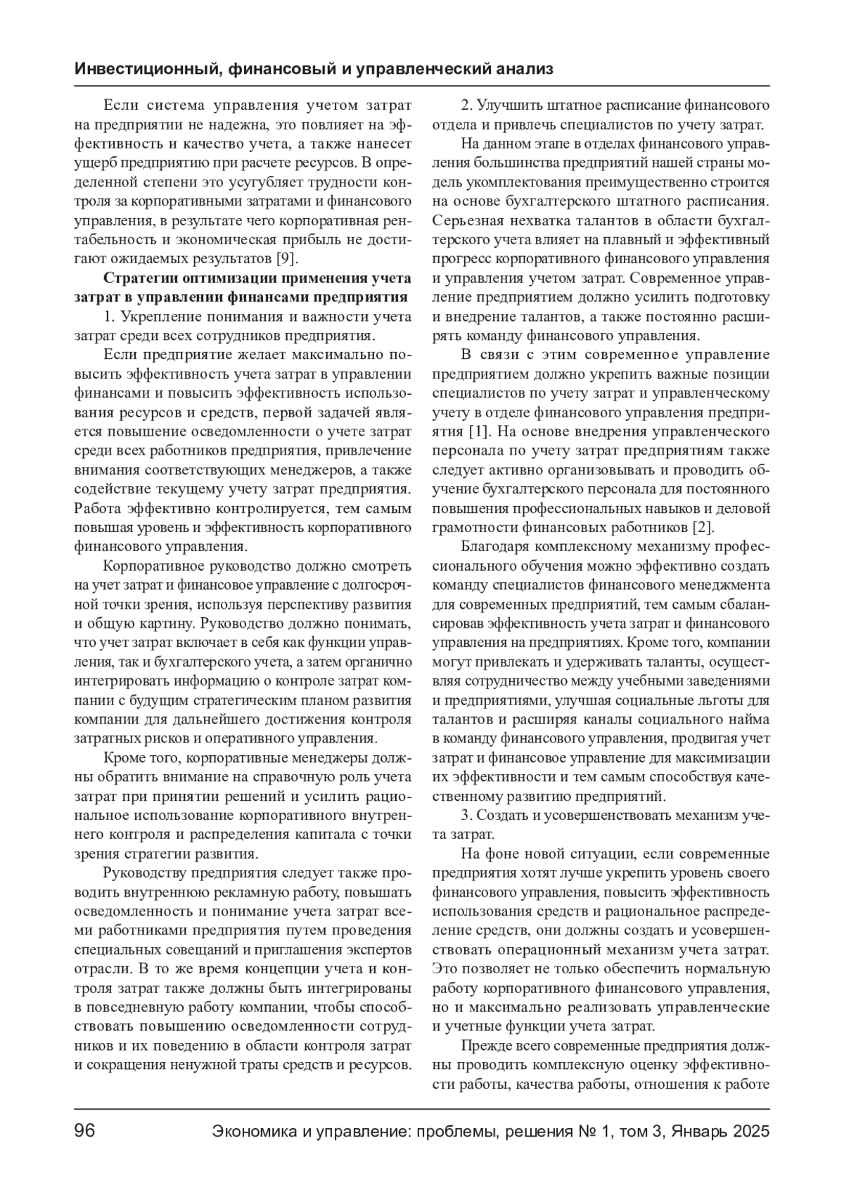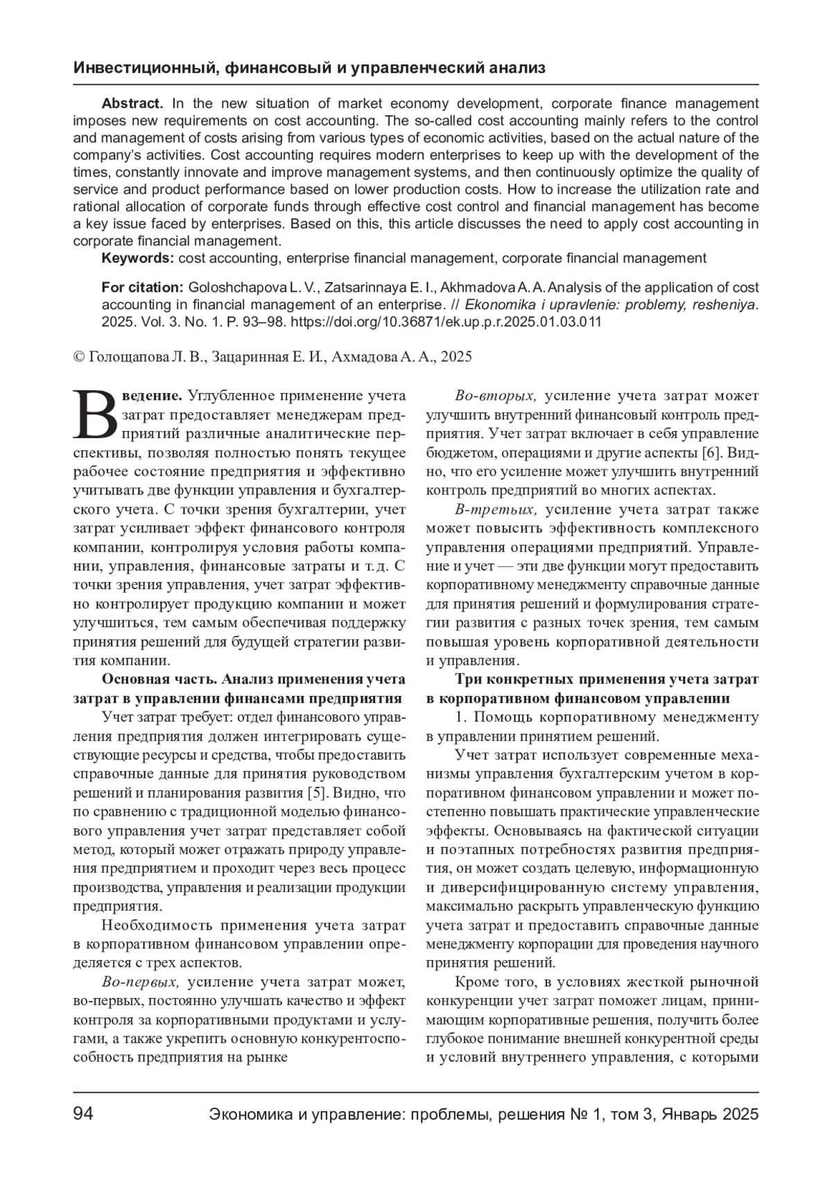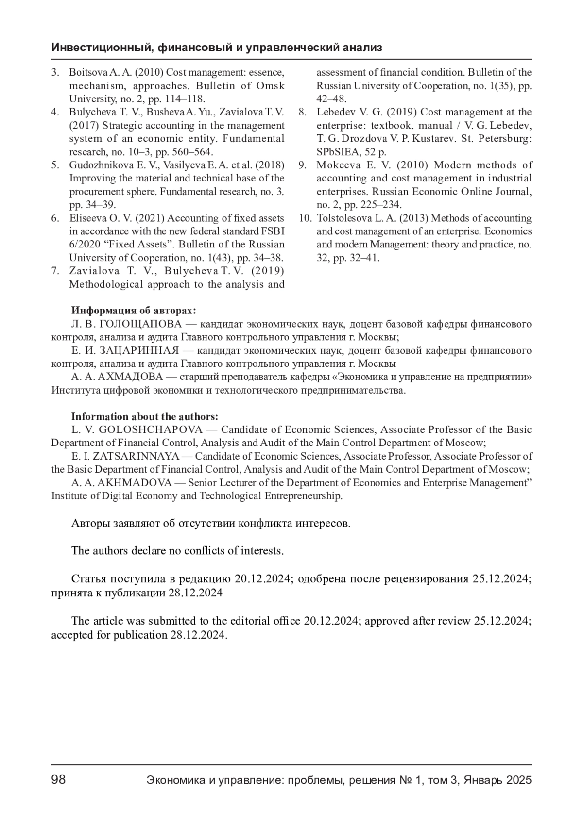 ГОЛОЩАПОВА Л. В., ЗАЦАРИННАЯ Е. И., АХМАДОВА А. А. АНАЛИЗ ПРИМЕНЕНИЯ УЧЕТА ЗАТРАТ В УПРАВЛЕНИИ ФИНАНСАМИ ПРЕДПРИЯТИЯ // ЭКОНОМИКА И УПРАВЛЕНИЕ: ПРОБЛЕМЫ, РЕШЕНИЯ. 2025. ТОМ 3 № 1