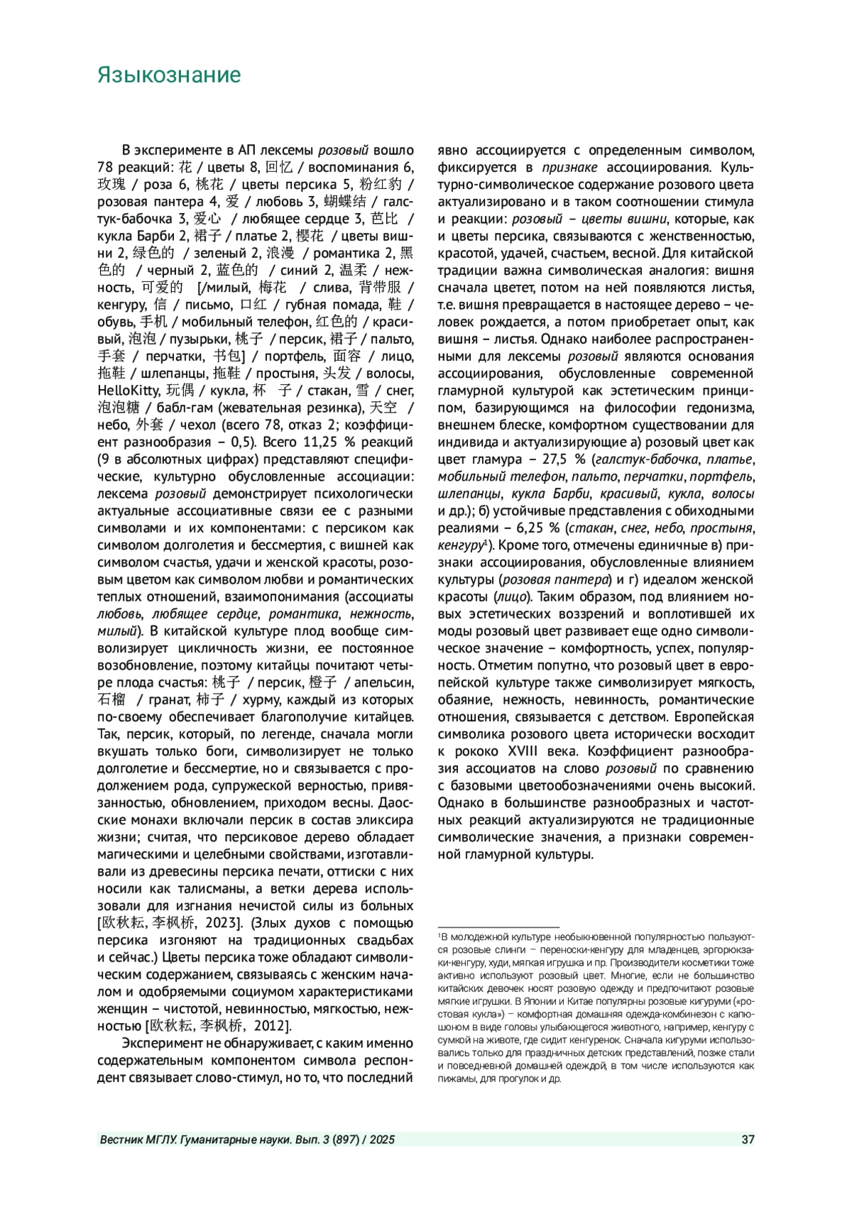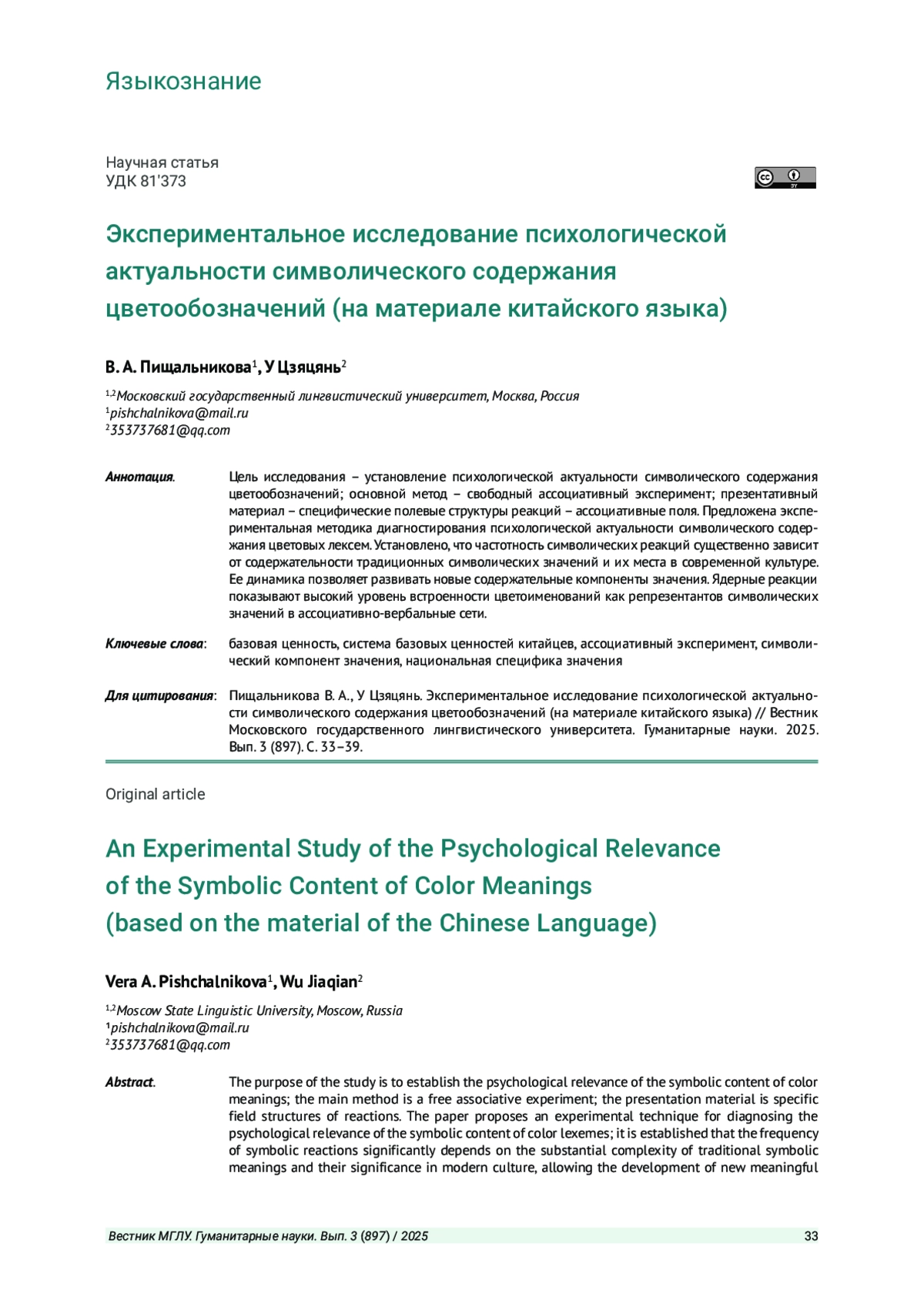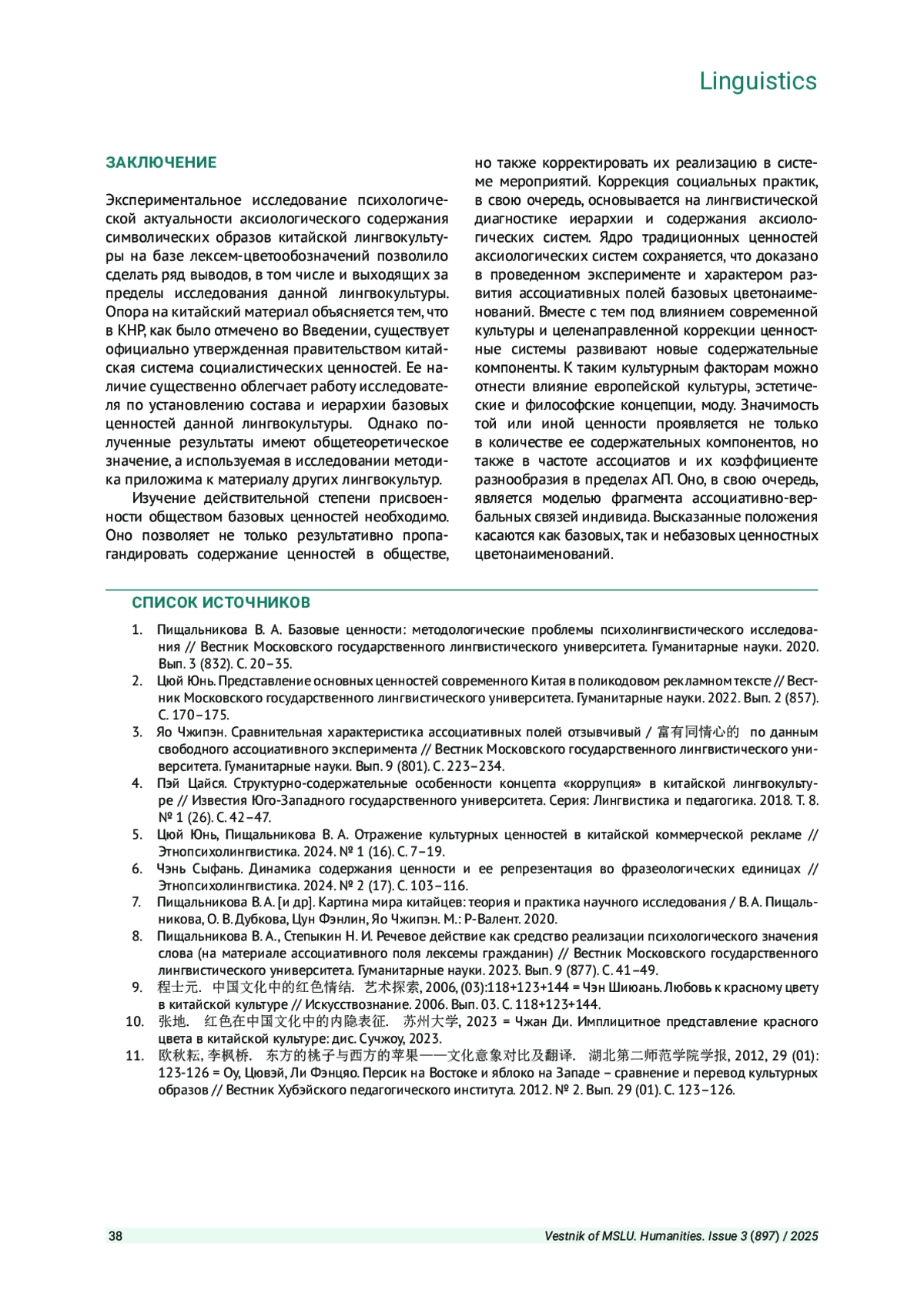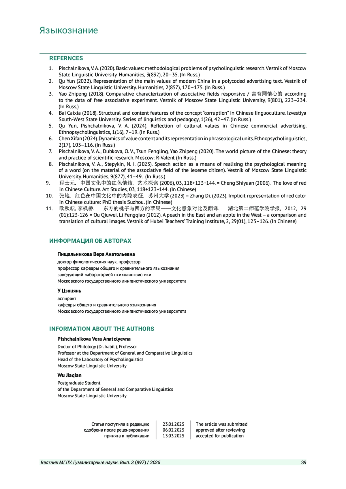 5. Цюй Юнь, Пищальникова В. А. Отражение культурных ценностей в китайской коммерческой рекламе // Этнопсихолингвистика. 2024. № 1 (16). С. 7-19. EDN: FGZIGE репрезентация во фразеологических единицах // Этнопсихолингвистика. 2024. № 2 (17). С. 103-116.