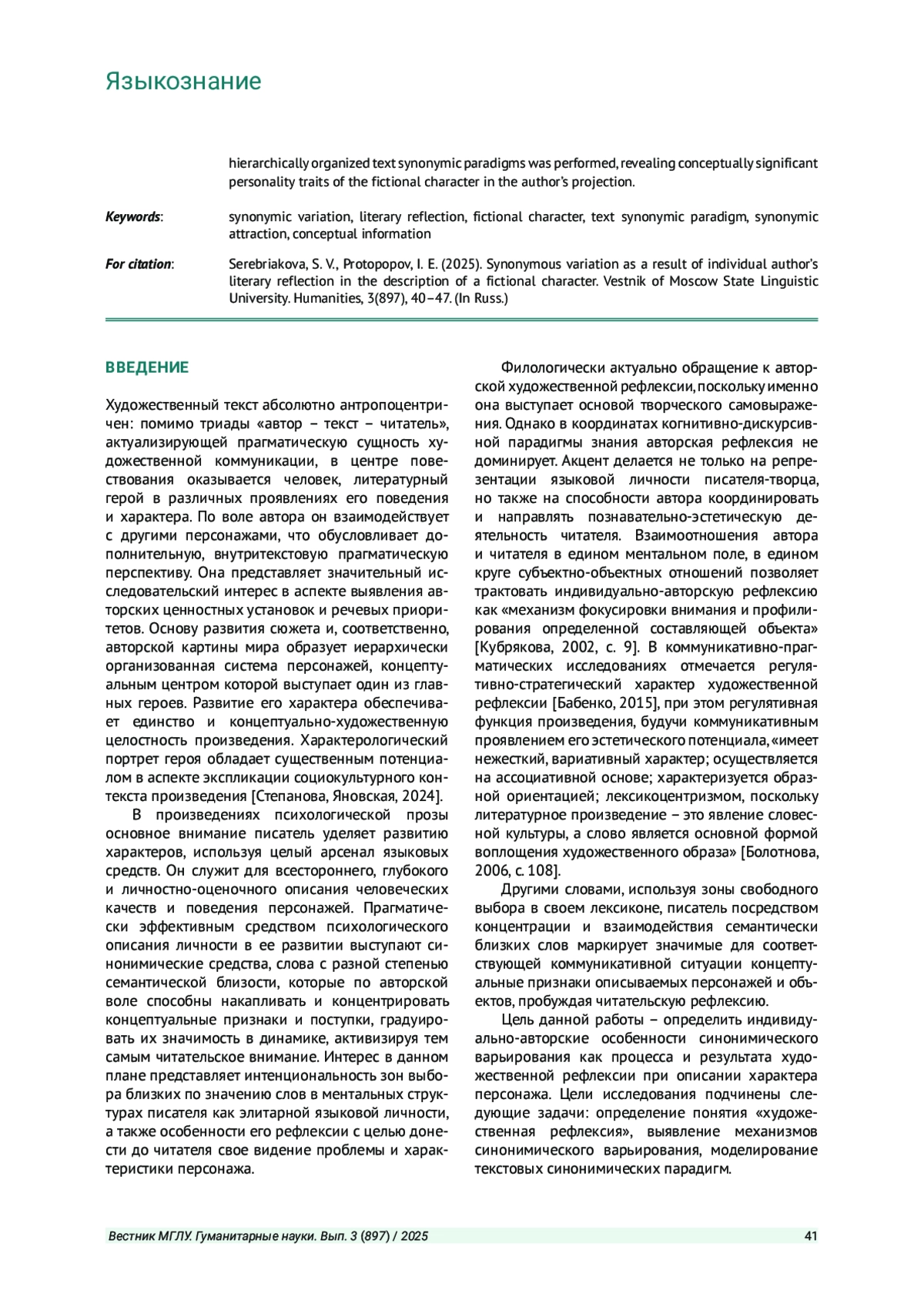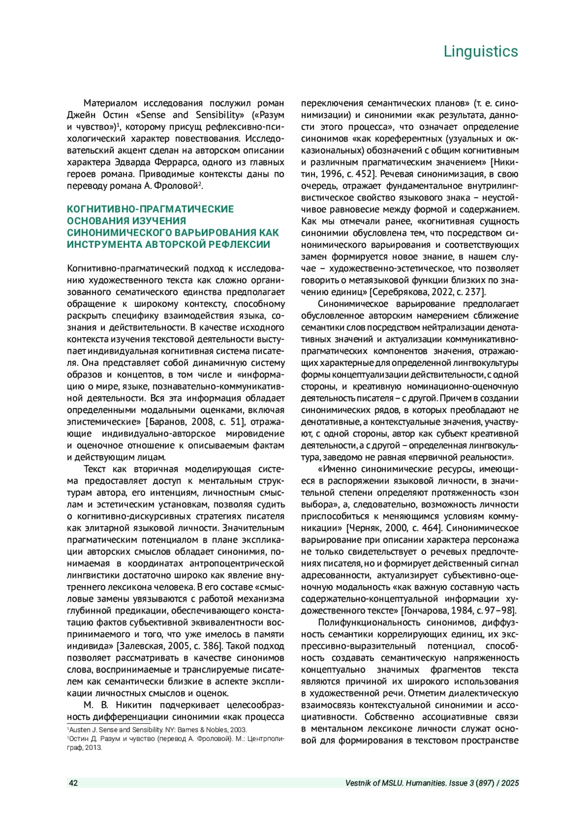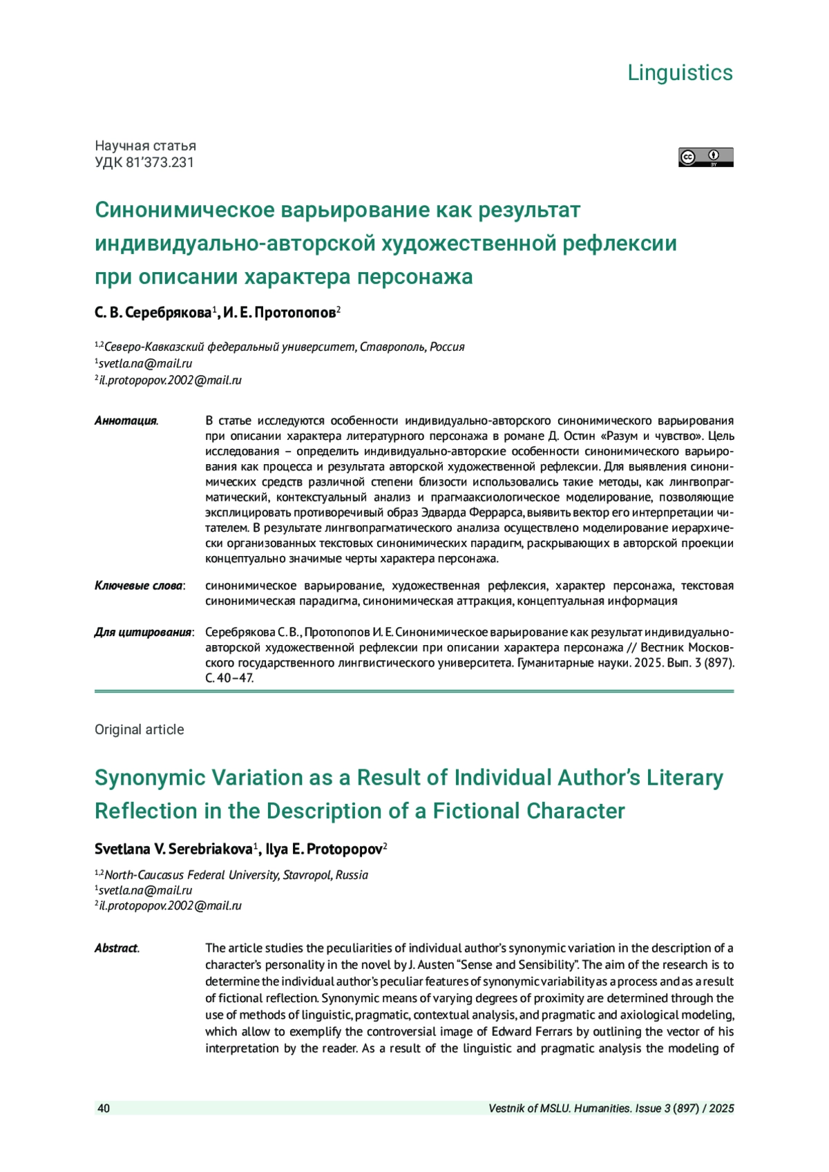 В статье исследуются особенности индивидуально-авторского синонимического варьирования при описании характера литературного персонажа в романе Д. Остин «Разум и чувство». Цель исследования - определить индивидуально-авторские особенности синонимического варьирования как процесса и результата авторской художественной рефлексии. Для выявления синонимических средств различной степени близости использовались такие методы, как лингвопрагматический, контекстуальный анализ и прагмааксиологическое моделирование, позволяющие эксплицировать противоречивый образ Эдварда Феррарса, выявить вектор его интерпретации читателем. В результате лингвопрагматического анализа осуществлено моделирование иерархически организованных текстовых синонимических парадигм, раскрывающих в авторской проекции концептуально значимые черты характера персонажа.