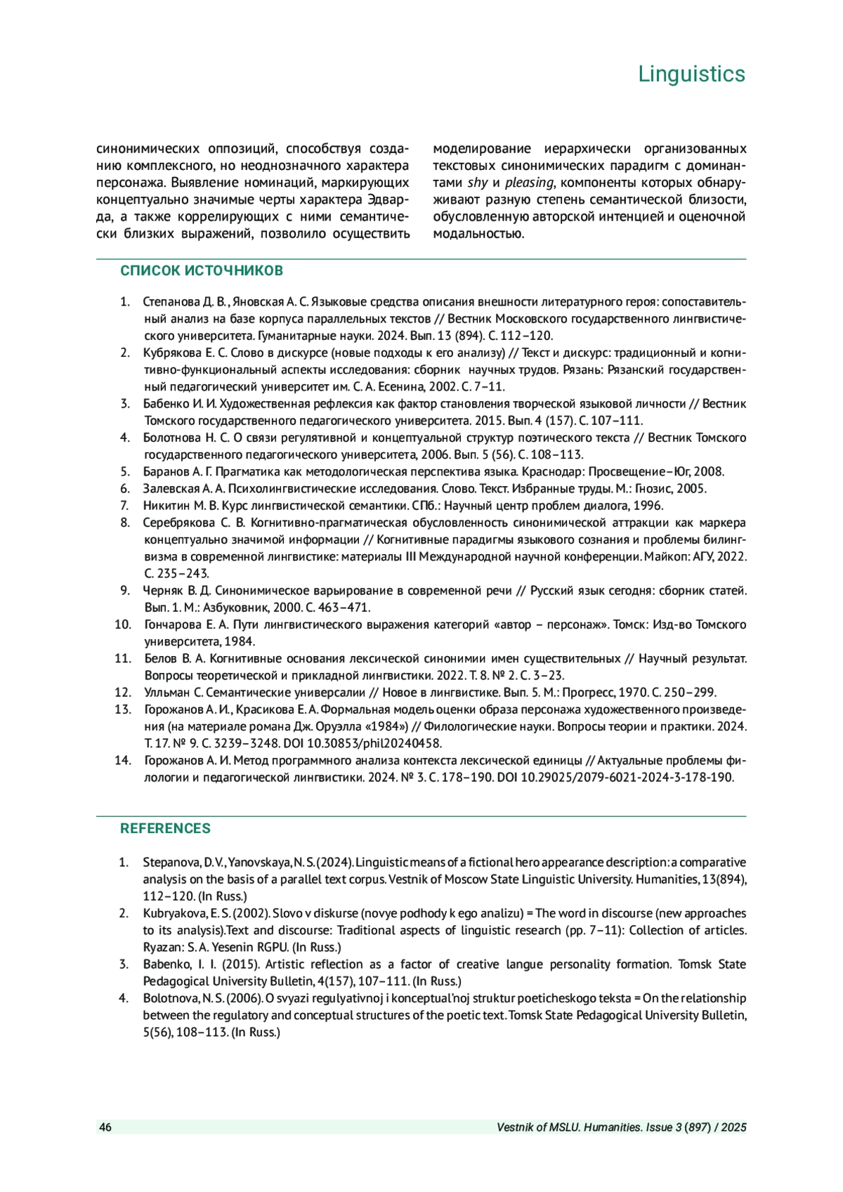 1. Степанова Д. В., Яновская А. С. Языковые средства описания внешности литературного героя: сопоставительный анализ на базе корпуса параллельных текстов // Вестник Московского государственного лингвистического университета. Гуманитарные науки. 2024. Вып. 13 (894). С. 112-120. EDN: PRKQII