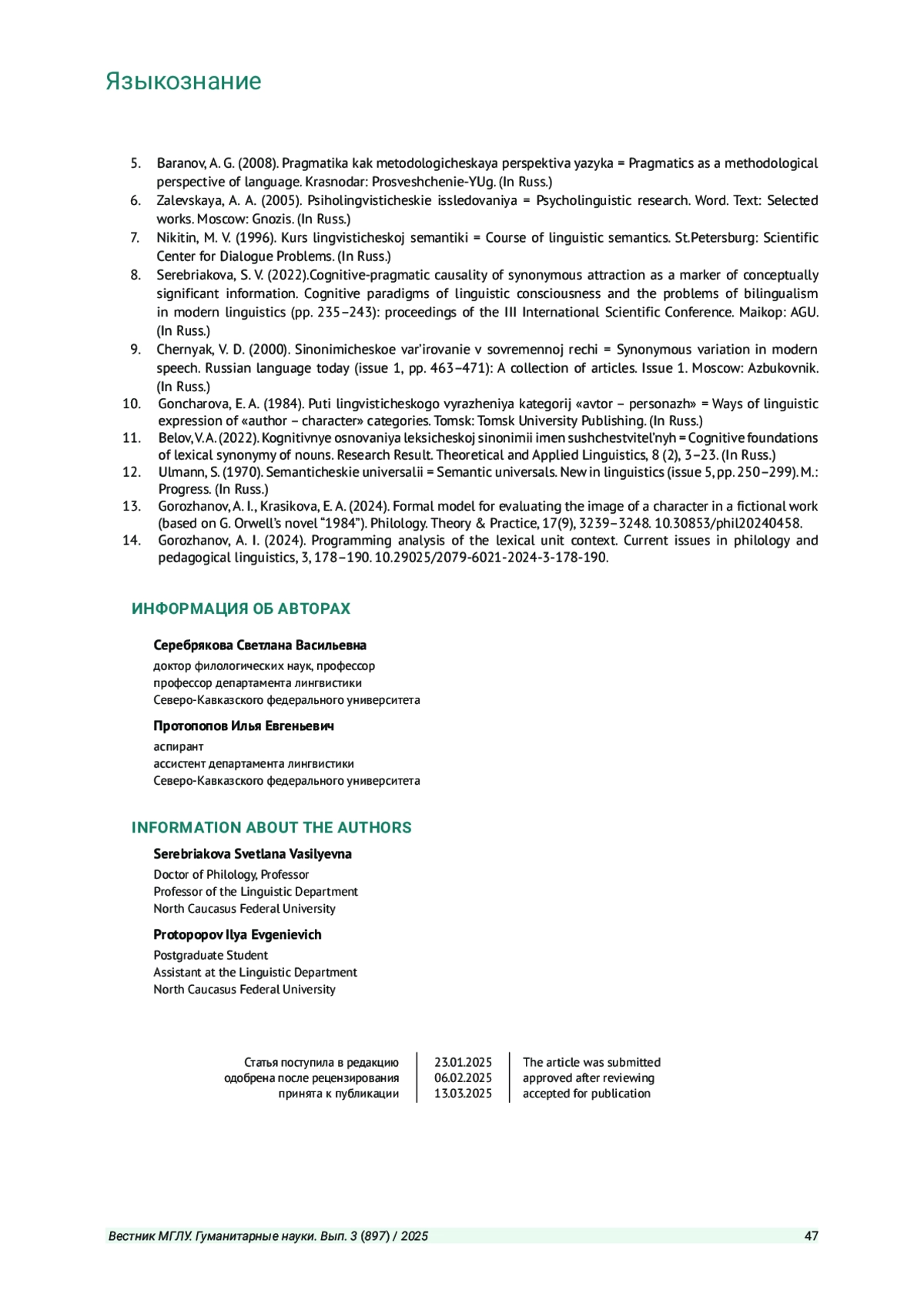 8. Серебрякова С. В. Когнитивно-прагматическая обусловленность синонимической аттракции как маркера концептуально значимой информации // Когнитивные парадигмы языкового сознания и проблемы билингвизма в современной лингвистике: материалы III Международной научной конференции. Майкоп: АГУ, 2022. С. 235-243. EDN: MKGRIU