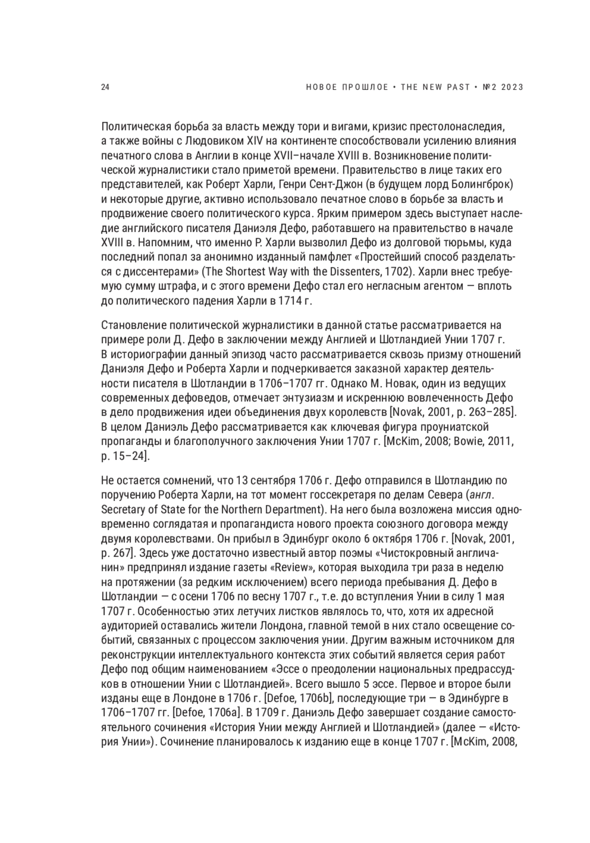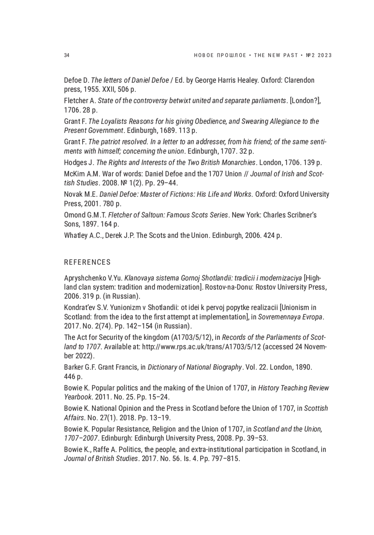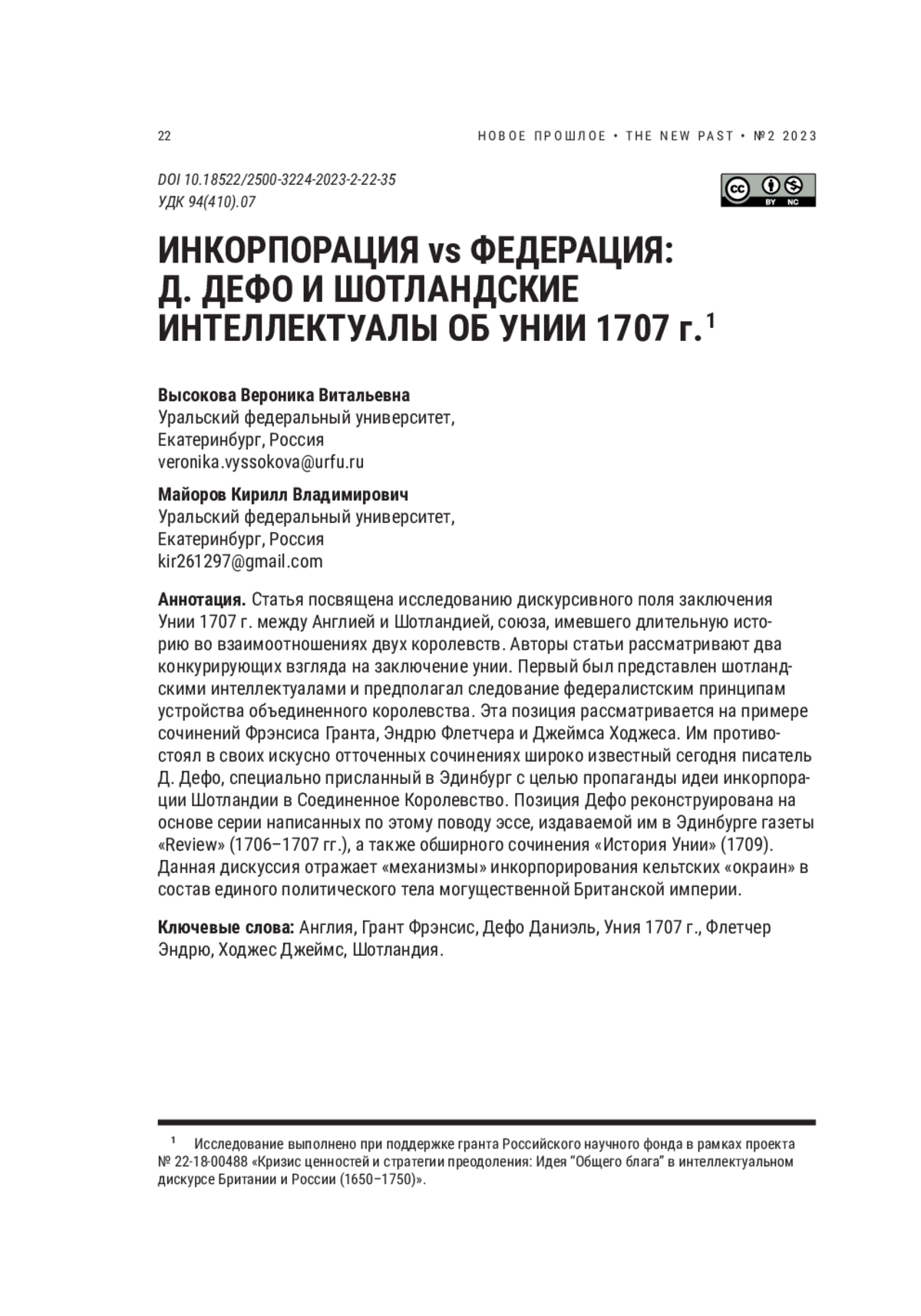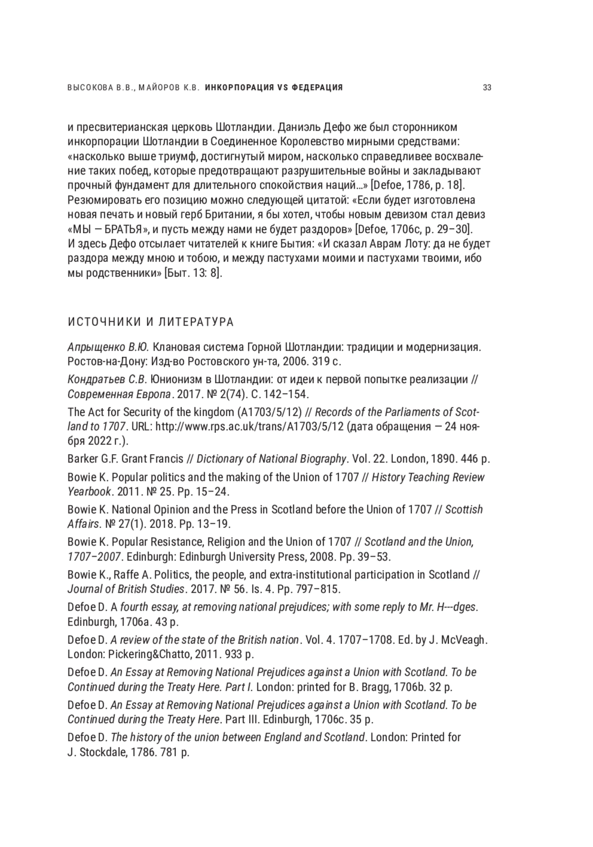 ВЫСОКОВА В. В., МАЙОРОВ К. В. ИНКОРПОРАЦИЯ VS ФЕДЕРАЦИЯ: Д. ДЕФО И ШОТЛАНДСКИЕ ИНТЕЛЛЕКТУАЛЫ ОБ УНИИ 1707 Г // НОВОЕ ПРОШЛОЕ. 2023. № 2