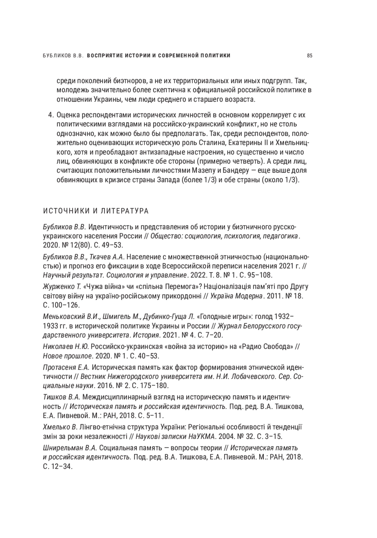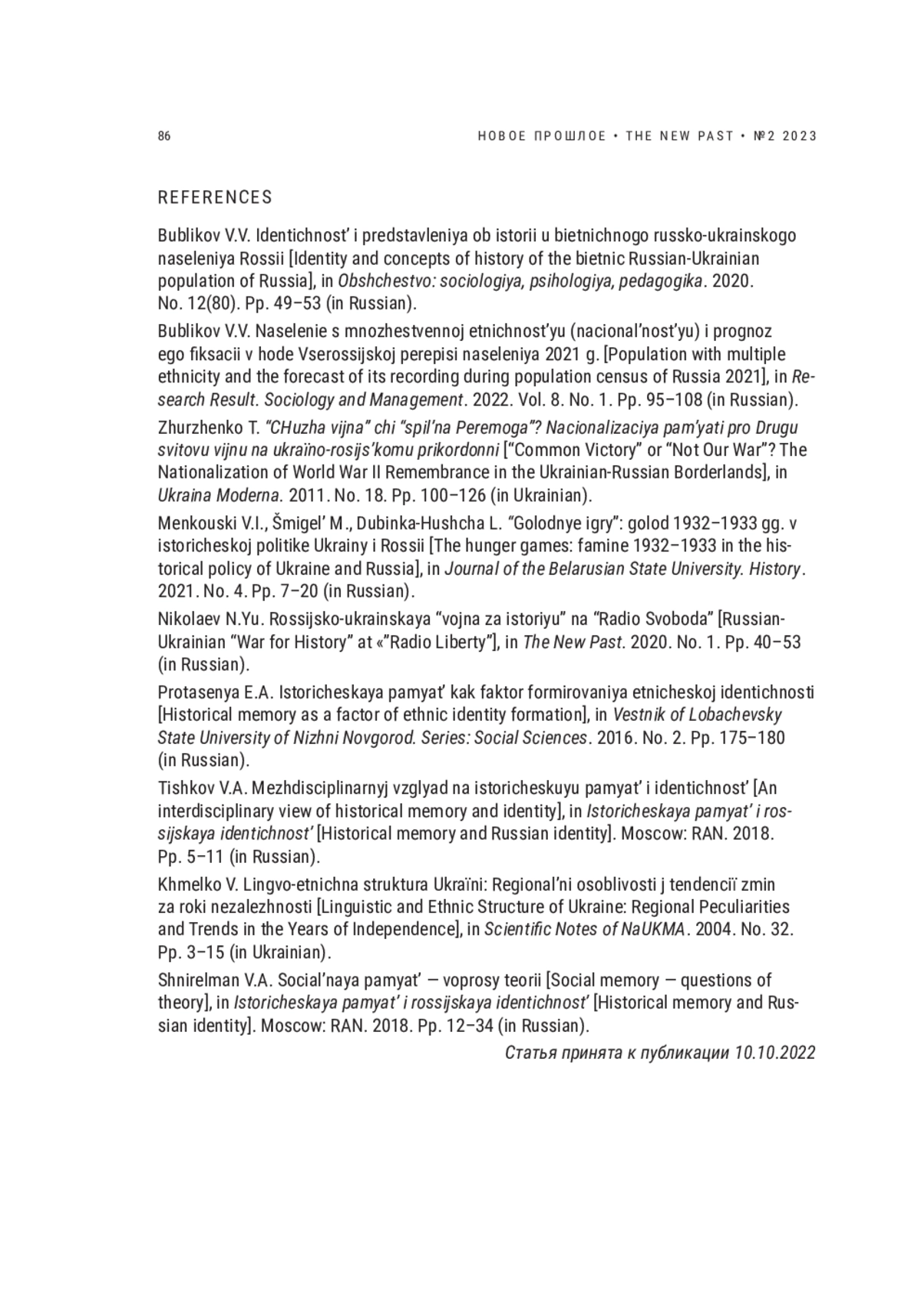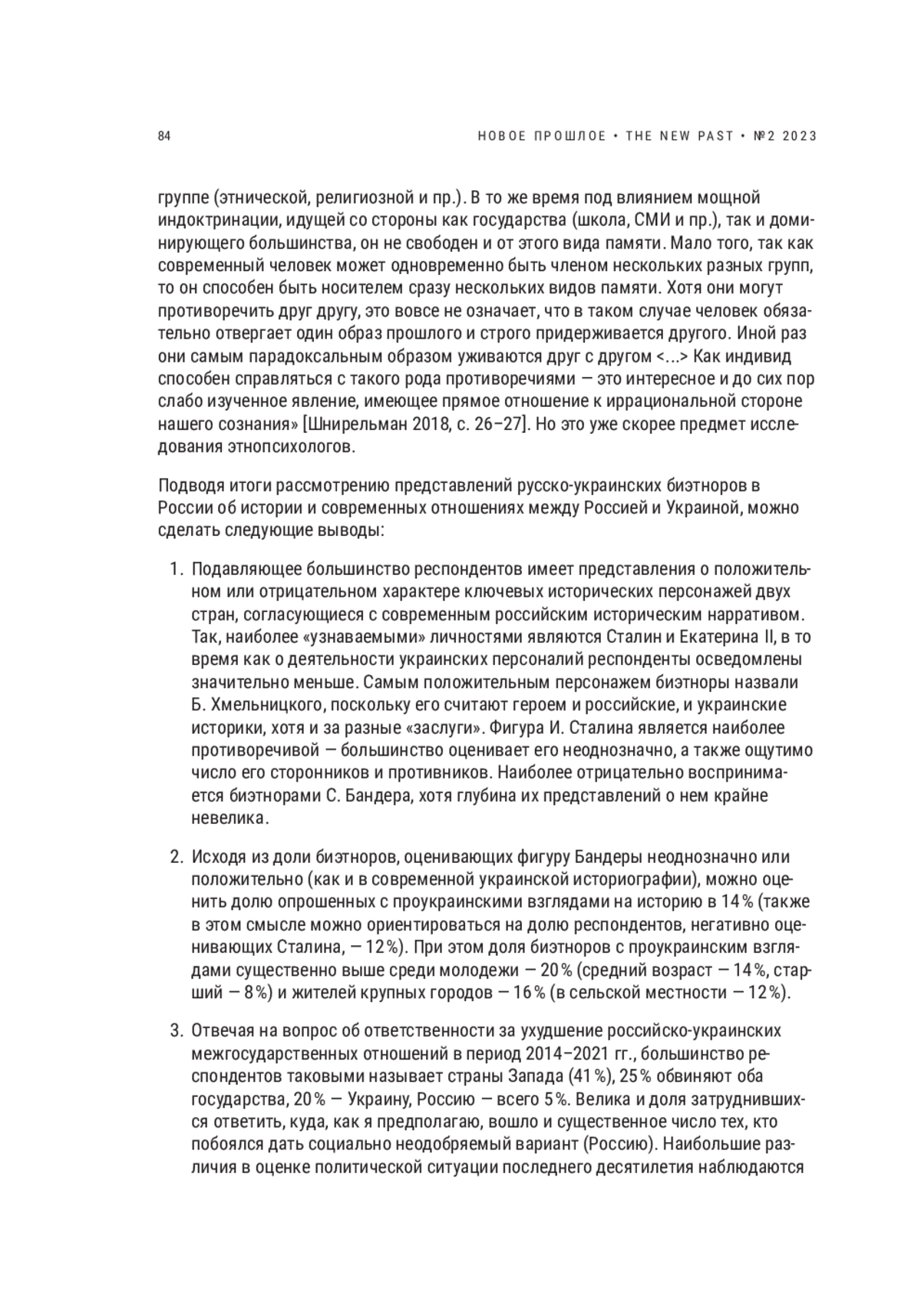 БУБЛИКОВ В. В. ВОСПРИЯТИЕ ИСТОРИИ И СОВРЕМЕННОЙ ПОЛИТИКИ РУССКО -УКРАИНСКИМИ БИЭТНОРАМИ В РОССИИ НАКАНУНЕ 2022 ГОДА: РОССИЙСКИЙ VS УКРАИНСКИЙ НАРРАТИВ // НОВОЕ ПРОШЛОЕ. 2023. № 2
