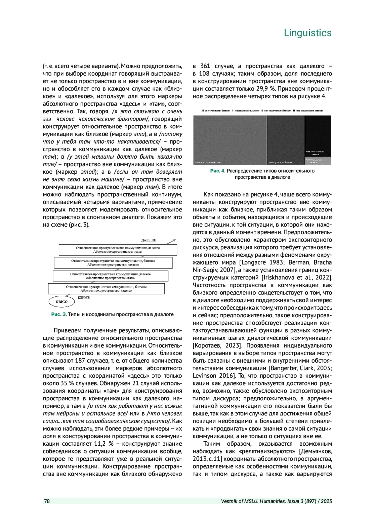 На материале спонтанных экспозиторных диалогов устанавливаются особенности пространственного дейксиса, проявляющиеся в конструировании относительного пространства в и вне ситуации коммуникации с учетом подтипов - близкого и далекого. Актуальность исследования определяется необходимостью уточнения роли пространственного дейксиса в конструировании пространства спонтанной диалогической коммуникации. Новизна работы связывается с выявлением четырех типов относительного пространства, а также с обнаружением их распределения. Результаты исследования показывают превалирование относительного пространства вне коммуникации как близкого, что определяется необходимостью «приблизить» к собеседнику объекты, отсутствующие в ситуации коммуникации, для выработки общей позиции.