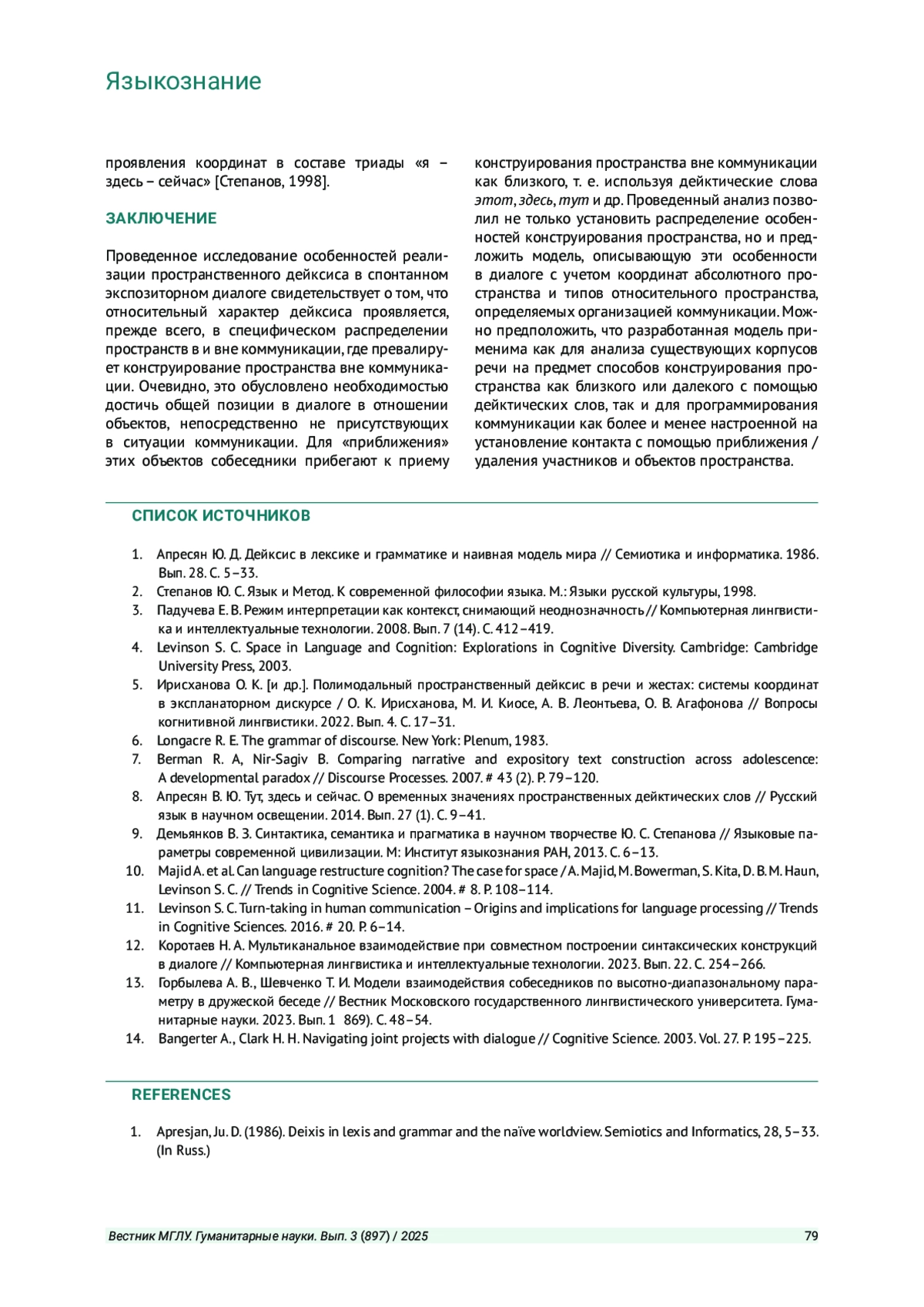 5. Ирисханова O. K. [и др.]. Полимодальный пространственный дейксис в речи и жестах: системы координат в экспланаторном дискурсе / O. K. Ирисханова, М. И. Киосе, A. В. Леонтьева, О. В. Агафонова // Вопросы когнитивной лингвистики. 2022. Вып. 4. С. 17-31. EDN: GCMSRK
