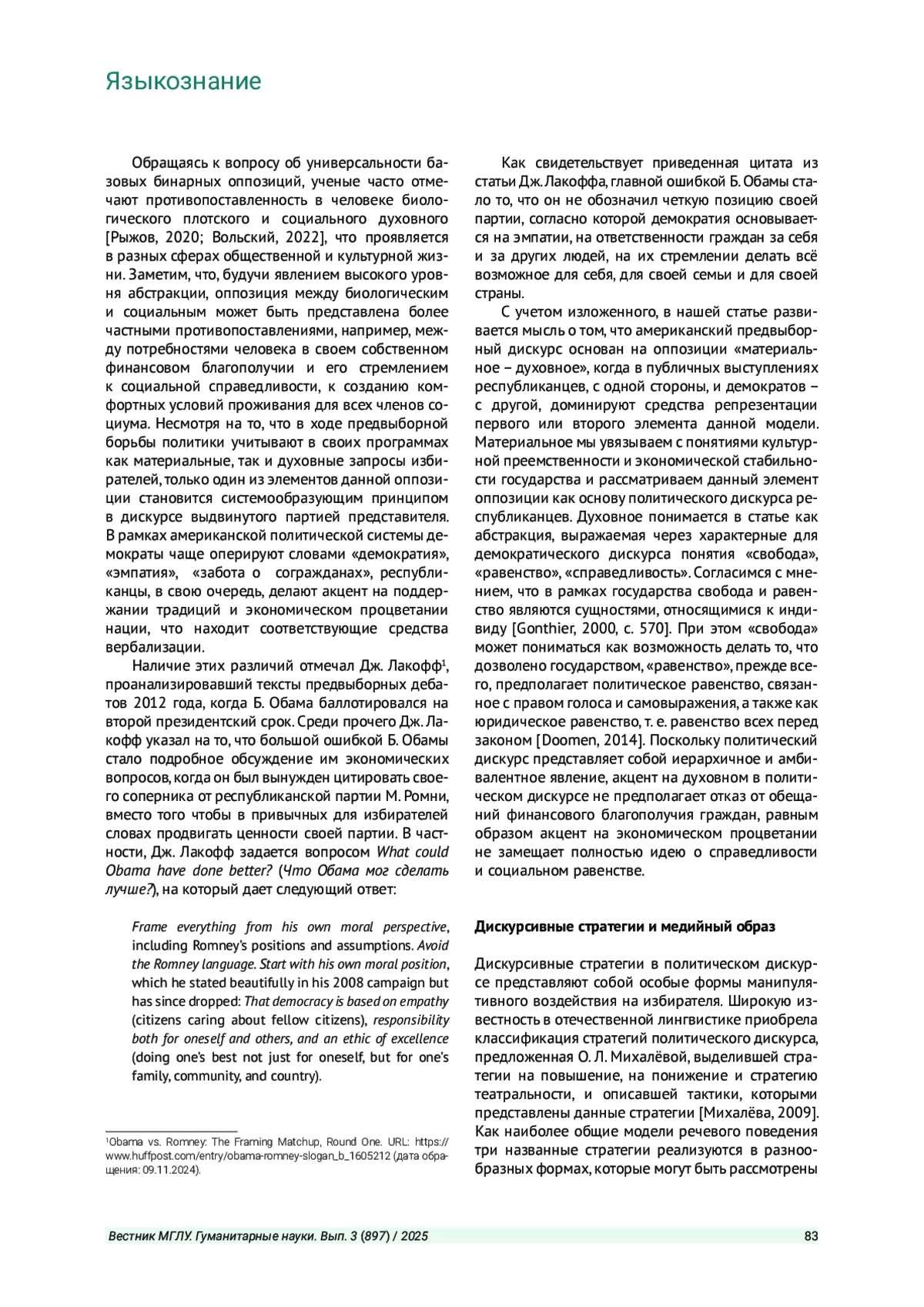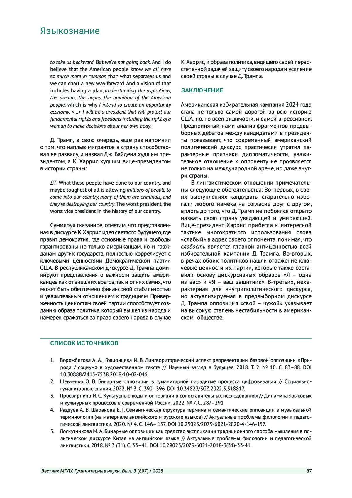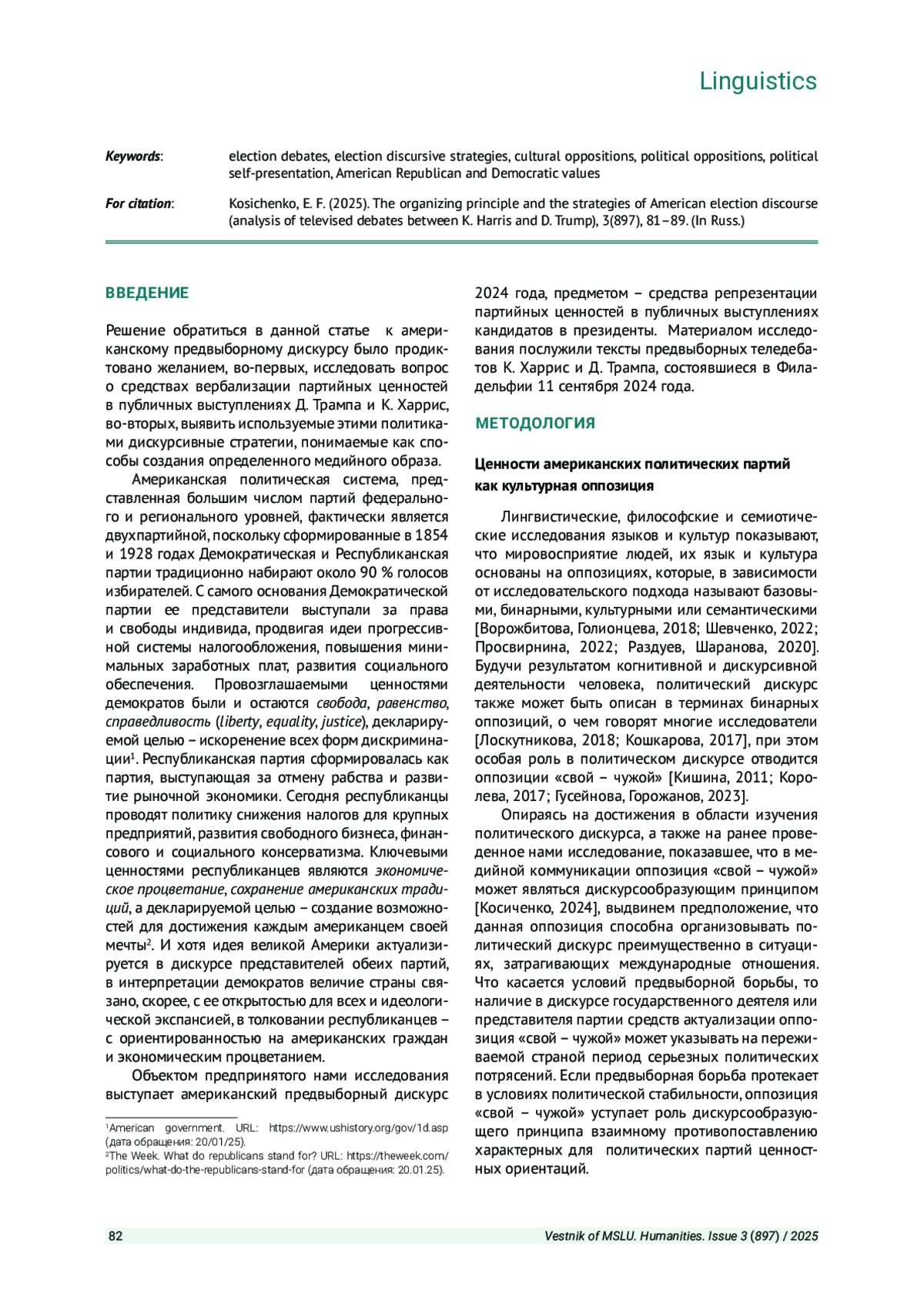 Решение обратиться в данной статье к американскому предвыборному дискурсу было продиктовано желанием, во-первых, исследовать вопрос о средствах вербализации партийных ценностей в публичных выступлениях Д. Трампа и К. Харрис, во-вторых, выявить используемые этими политиками дискурсивные стратегии, понимаемые как способы создания определенного медийного образа.