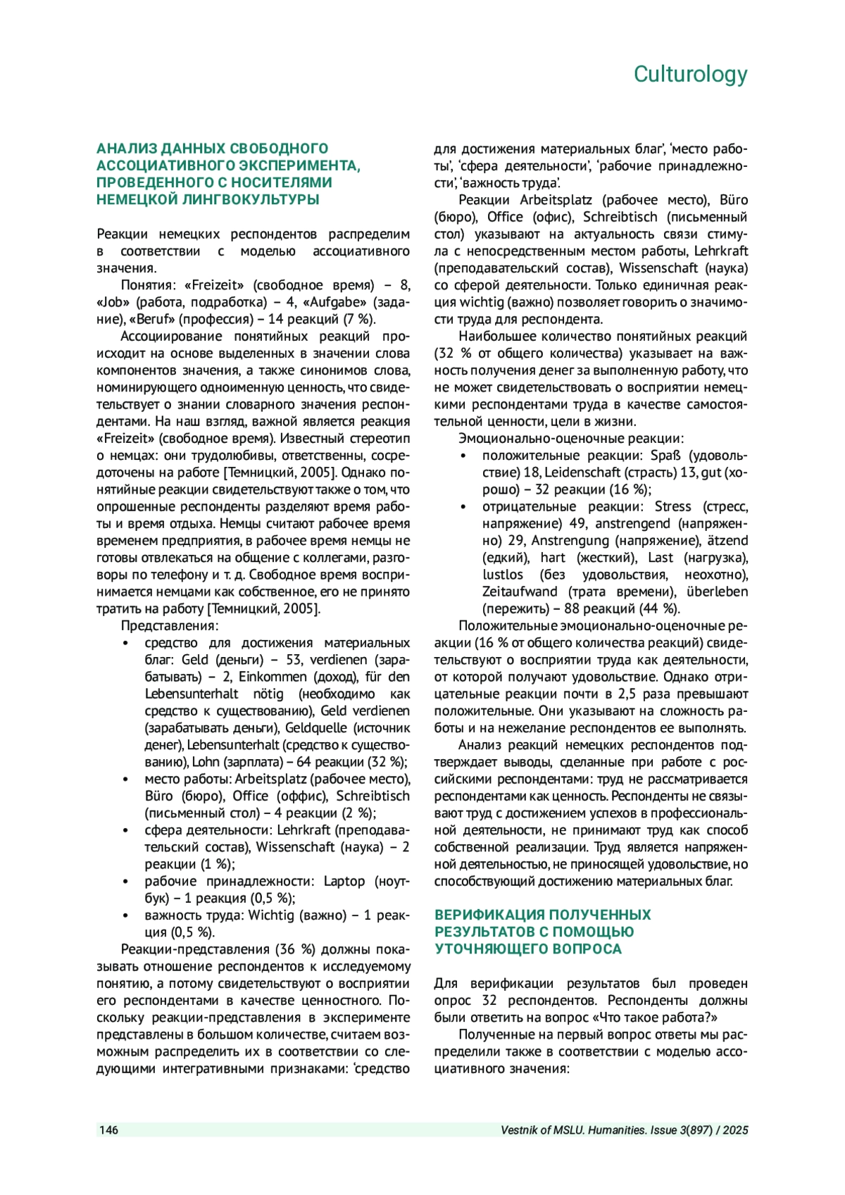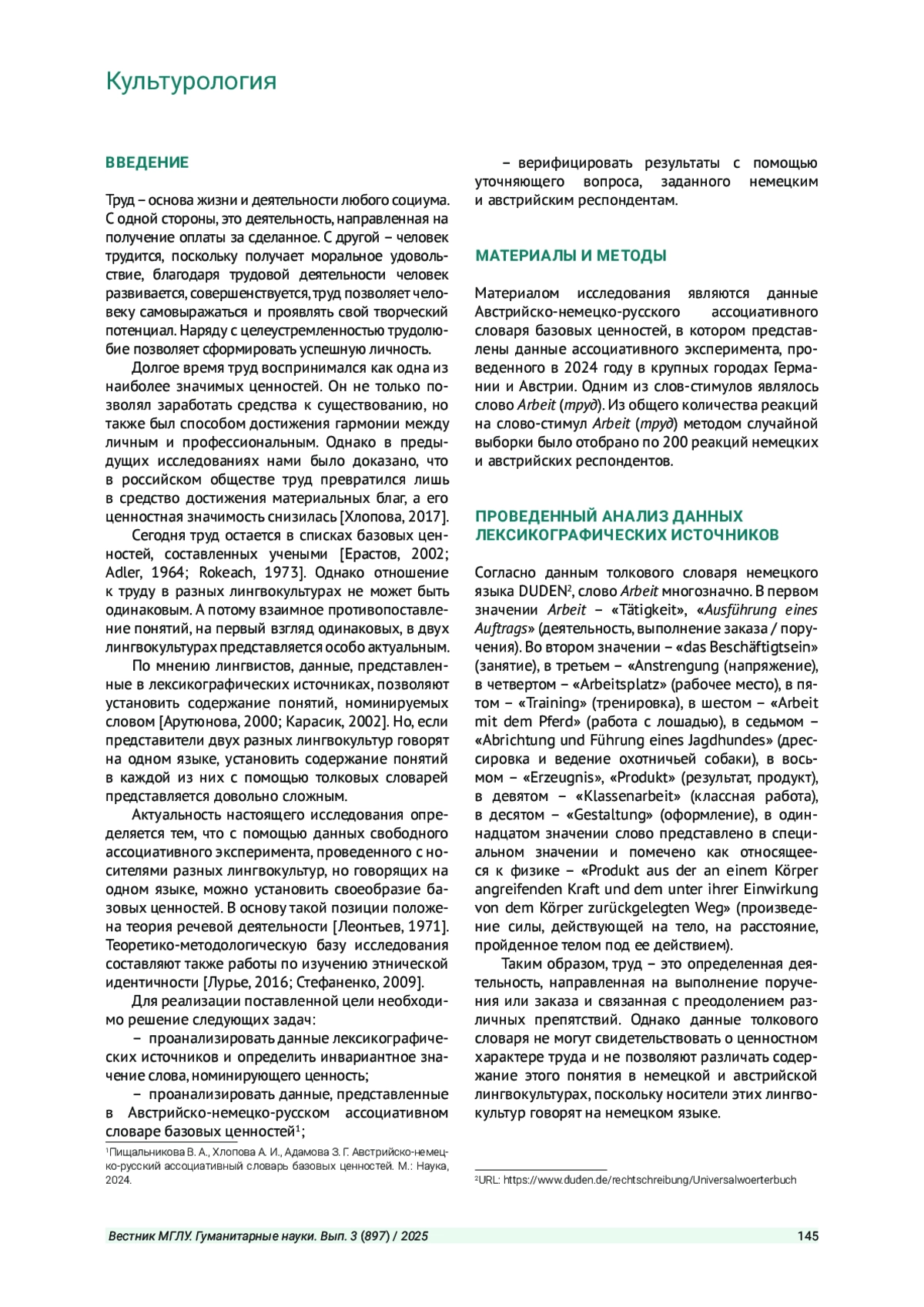 ХЛОПОВА А. И. СОПОСТАВЛЕНИЕ ЦЕННОСТИ ARBEIT (ТРУД) В НЕМЕЦКОЙ И АВСТРИЙСКОЙ ЛИНГВОКУЛЬТУРАХ // ВЕСТНИК МОСКОВСКОГО ГОСУДАРСТВЕННОГО ЛИНГВИСТИЧЕСКОГО УНИВЕРСИТЕТА. ГУМАНИТАРНЫЕ НАУКИ. 2025. № 3 (897)