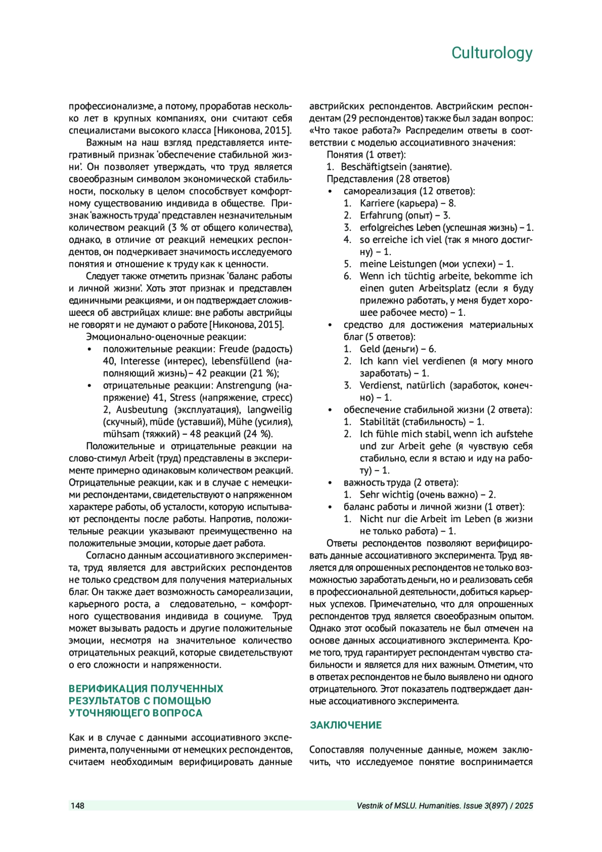 Ключевые фразы: Германия, Австрия, ассоциативный эксперимент, ценность, ТРУД