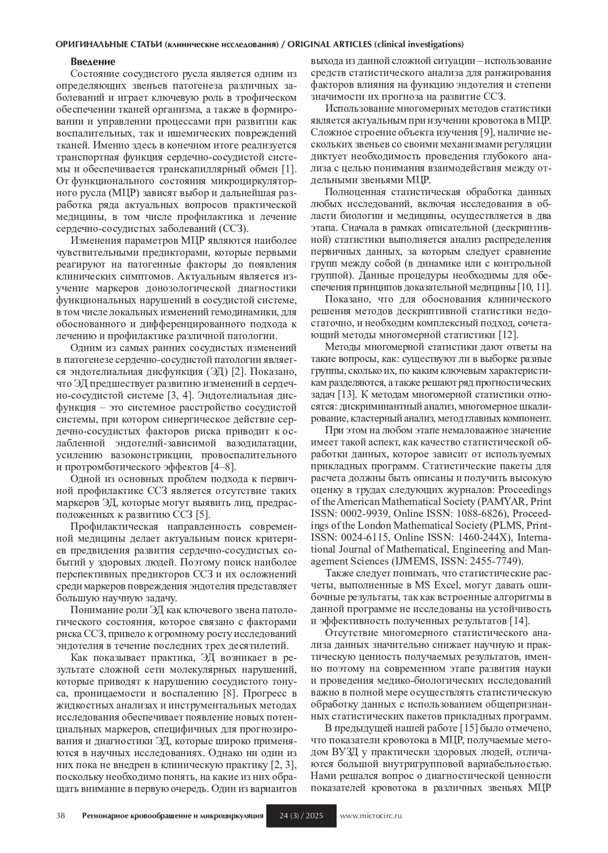Введение. Изменения параметров микроциркуляторного русла (МЦР) являются наиболее чувствительными предикторами, которые первыми реагируют на патогенные факторы до появления клинических симптомов. При сравнении линейных и объемных показателей кровотока в МЦР, получаемых методом высокочастотной ультразвуковой допплерографии (ВУЗД), у 25 здоровых лиц в покое методом главных компонент показатели обследуемых разделились на 3 группы. Цель – на основе дискриминантного анализа (ДА) определить наиболее значимые показатели кровотока в МЦР, влияющие на разделение практически здоровых лиц. Материалы и методы. На основе подобранных дискриминантных функций были сформированы три классификационные функции, куда вошли только те характеристики, которые повлияли на разделение обследуемых. К ним относятся: максимальная линейная систолическая скорость Vs, максимальная линейная средняя скорость Vm, средняя объемная систолическая скорость Qas, максимальная линейная диастолическая скорость Vd. Результаты. По показателям кровотока в МЦР обследуемые разделились на группы: в 1-й группе следующие показатели кровотока были ниже границы доверительного интервала (ГДИ) (Vs=1,12 см/с, Vm=0,77 см/с, Vd=0,39 см/с), а Qas=0,55 мл/ мин – выше ГДИ. Для 2-й группы характерны высокие значения Vm и Vd (выше 1,26 см/с и 0,9 см/с соответственно) при значении Qas ниже 0,229 мл/мин, показатель Vs находится в пределах ГДИ. Группа 3 характеризуется значениями: Vs=1,89 см/с (выше ГДИ), Vd= 0,42 см/с (ниже ГДИ), Vm и Qas в ГДИ (1,17 см/с, 0,28 мл/мин соответственно).