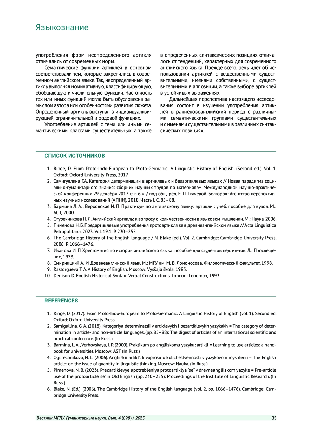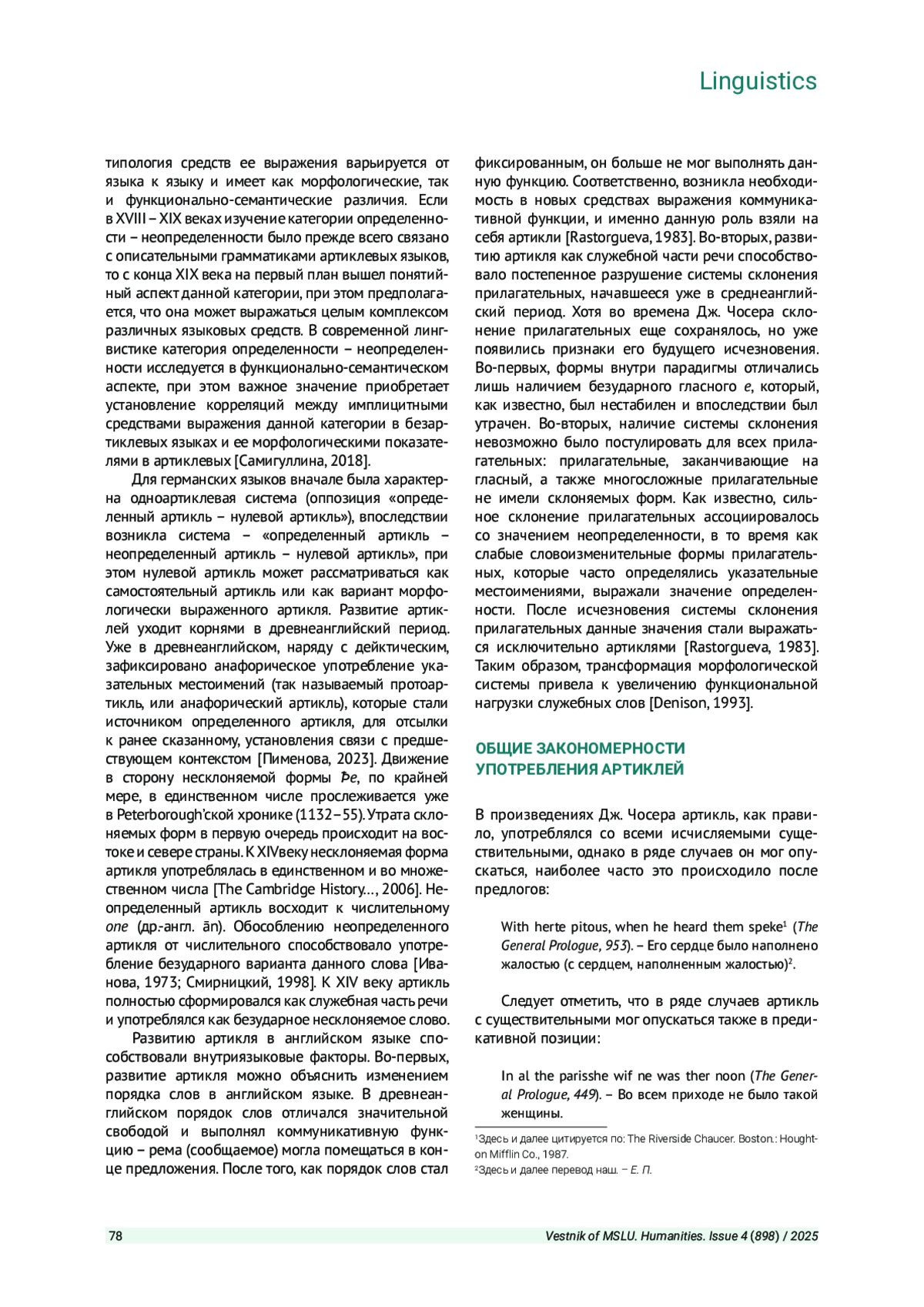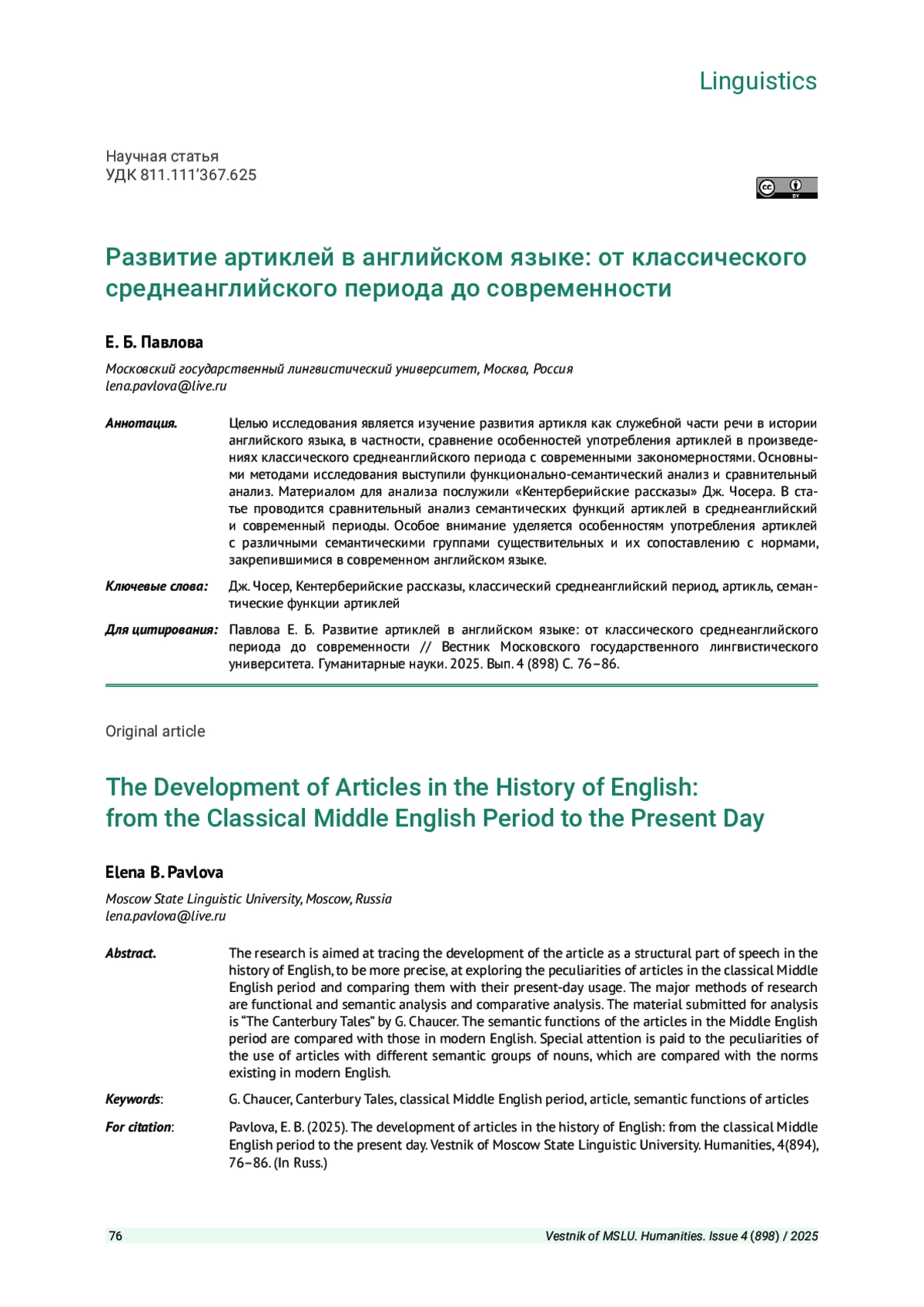 ПАВЛОВА Е. Б. РАЗВИТИЕ АРТИКЛЕЙ В АНГЛИЙСКОМ ЯЗЫКЕ: ОТ КЛАССИЧЕСКОГО СРЕДНЕАНГЛИЙСКОГО ПЕРИОДАДО СОВРЕМЕННОСТИ // ВЕСТНИК МОСКОВСКОГО ГОСУДАРСТВЕННОГО ЛИНГВИСТИЧЕСКОГО УНИВЕРСИТЕТА. ГУМАНИТАРНЫЕ НАУКИ. 2025. № 4 (898)
