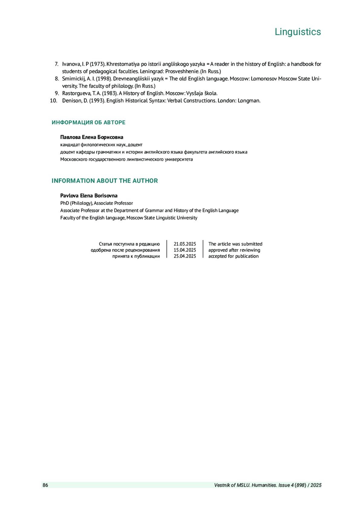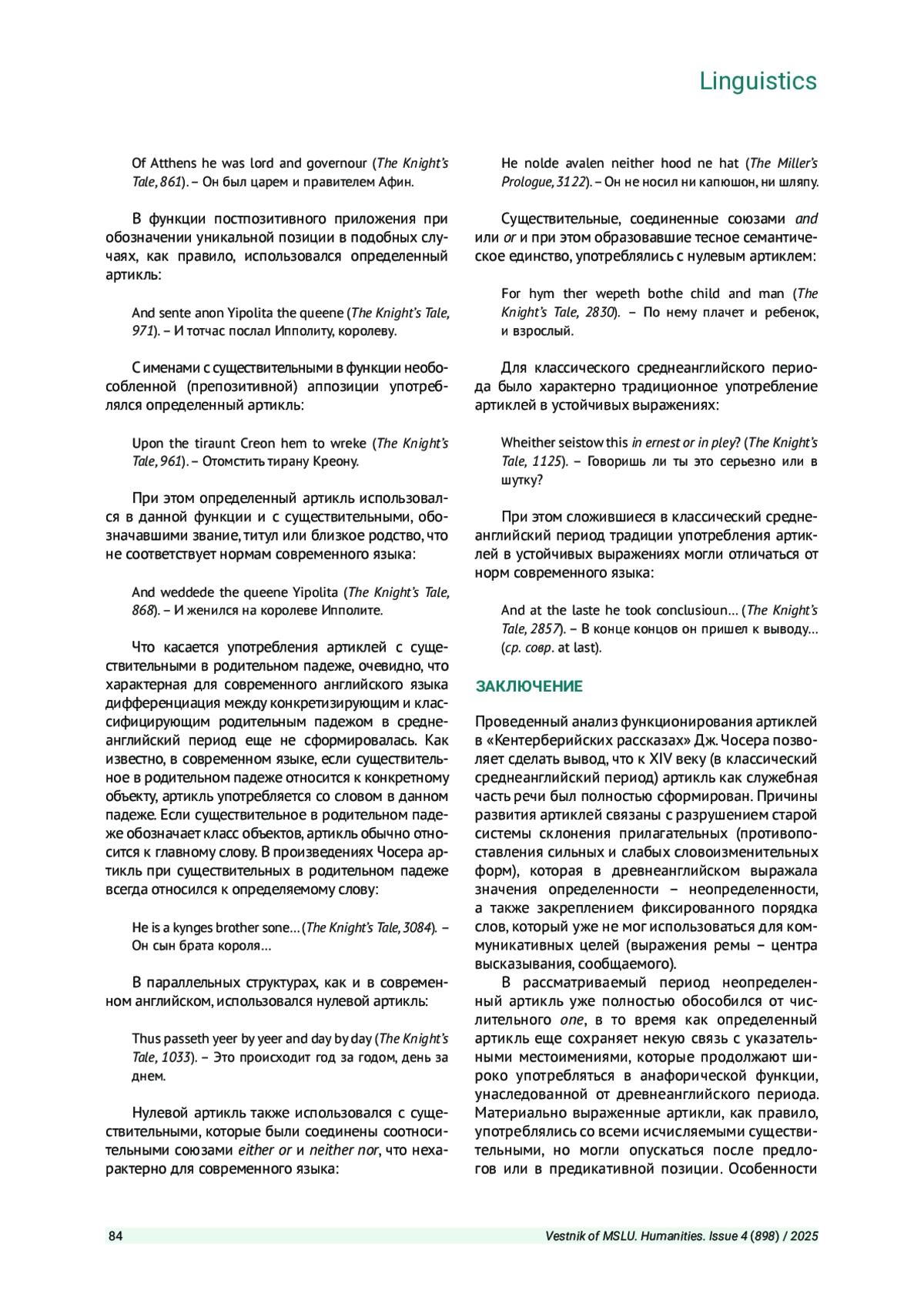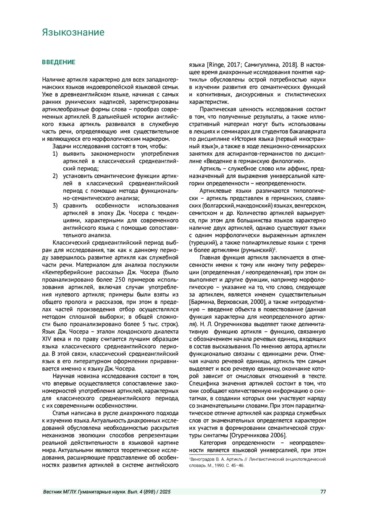ПАВЛОВА Е. Б. РАЗВИТИЕ АРТИКЛЕЙ В АНГЛИЙСКОМ ЯЗЫКЕ: ОТ КЛАССИЧЕСКОГО СРЕДНЕАНГЛИЙСКОГО ПЕРИОДАДО СОВРЕМЕННОСТИ // ВЕСТНИК МОСКОВСКОГО ГОСУДАРСТВЕННОГО ЛИНГВИСТИЧЕСКОГО УНИВЕРСИТЕТА. ГУМАНИТАРНЫЕ НАУКИ. 2025. № 4 (898)