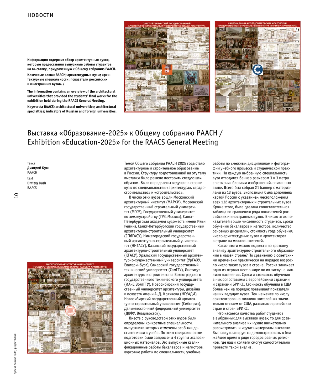 Темой Общего собрания РААСН 2025 года стало архитектурное и строительное образование в России. Структуру подготовленной на эту тему выставки было решено построить следующим образом. Были определены ведущие в стране вузы по специальностям «архитектура», «градостроительство» и «строительство».