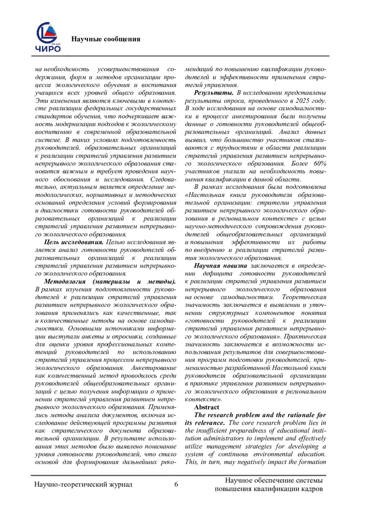 Проблема исследования и обоснование ее актуальности. Основная проблема исследования заключается в недостаточной подготовленности руководящих кадров образовательных учреждений к внедрению и эффективному использованию стратегий управления развитием системы непрерывного экологического образования. Это, в свою очередь, может негативно влиять на формирование фундаментальных основ и развитие экологической культуры у обучающихся всех ступеней общего образования. Актуальность выбранной темы исследования определяется происходящими изменениями в государственном курсе по экологическому образованию, ориентированными на необходимость усовершенствования содержания, форм и методов организации процесса экологического обучения и воспитания учащихся всех уровней общего образования. Эти изменения являются ключевыми в контексте реализации федеральных государственных стандартов обучения, что подчеркивает важность модернизации подходов к экологическому воспитанию в современной образовательной системе. В таких условиях подготовленность руководителей. образовательных организаций к реализации стратегий управления развитием непрерывного экологического образования становится важным и требует проведения научного обоснования и исследования. Следовательно, актуальным является определение методологических, нормативных и методических оснований определения условий формирования и диагностики готовности руководителей образовательных организаций к реализации стратегий управления развитием непрерывного экологического образования. Цель исследования. Целью исследования является анализ готовности руководителей образовательных организаций к реализации стратегий управления развитием непрерывного экологического образования. Методология (материалы и методы). В рамках изучения подготовленности руководителей к реализации стратегий управления развитием непрерывного экологического образования применялись как качественные, так и количественные методы на основе самодиагностики. Основными источниками информации выступали анкеты и опросники, созданные для оценки уровня профессиональных компетенций руководителей по использованию стратегий управления процессом непрерывного экологического образования. Анкетирование как количественный метод проводилось среди руководителей общеобразовательных организаций с целью получения информации о применении стратегий управления развитием непрерывного экологического образования. Применялись методы анализа документов, включая исследование действующей программы развития как стратегического документа образовательной организации. В результате использования этих методов было выявлено понимание уровня готовности руководителей, что стало основой для формирования дальнейших рекомендаций по повышению квалификации руководителей и эффективности применения стратегий управления. Результаты. В исследовании представлены результаты опроса, проведенного в 2025 году. В ходе исследования на основе самодиагностики в процессе анкетирования были получены данные о готовности руководителей общеобразовательных организаций. Анализ данных выявил, что большинство участников сталкиваются с трудностями в области реализации стратегий управления развитием непрерывного эколог