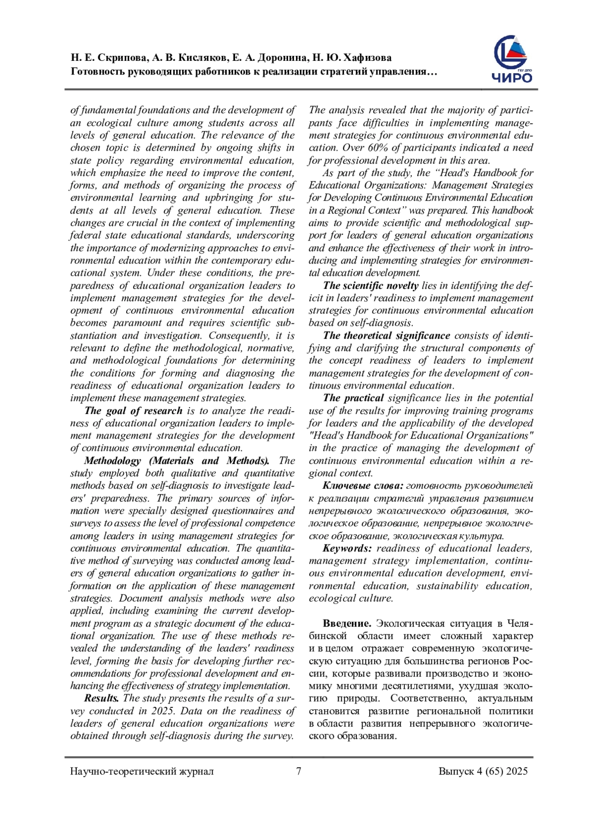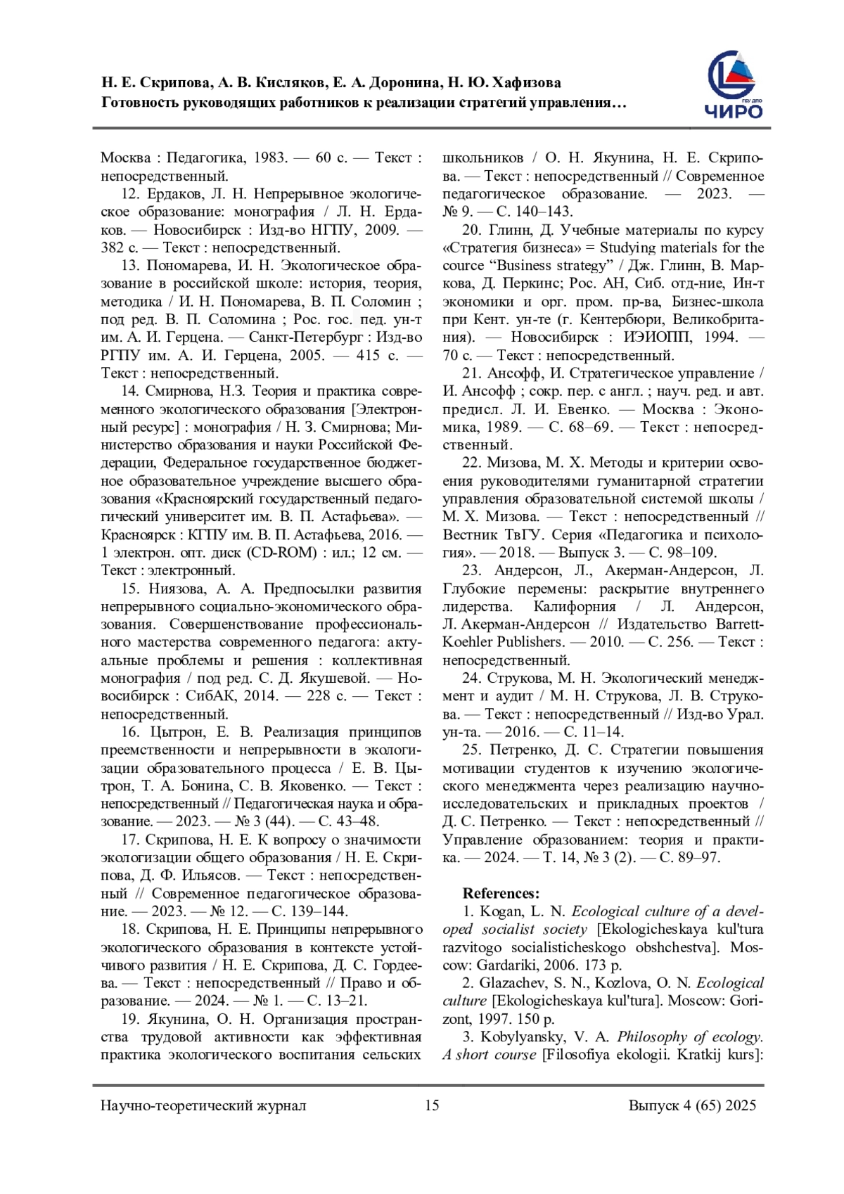 17. Скрипова, Н. Е. К вопросу о значимости экологизации общего образования / Н. Е. Скрипова, Д. Ф. Ильясов. - Текст : непосредственный // Современное педагогическое образование. - 2023. - № 12. - С. 139-144.