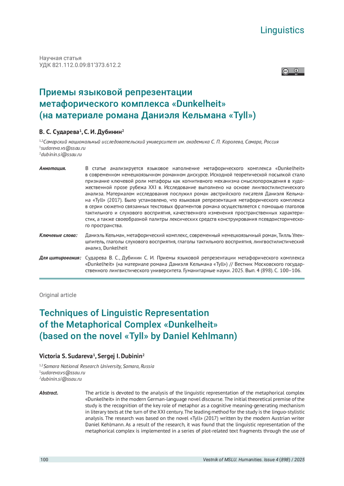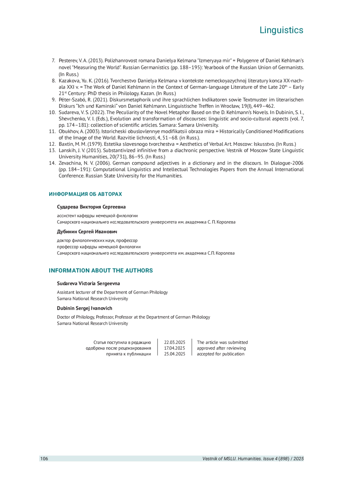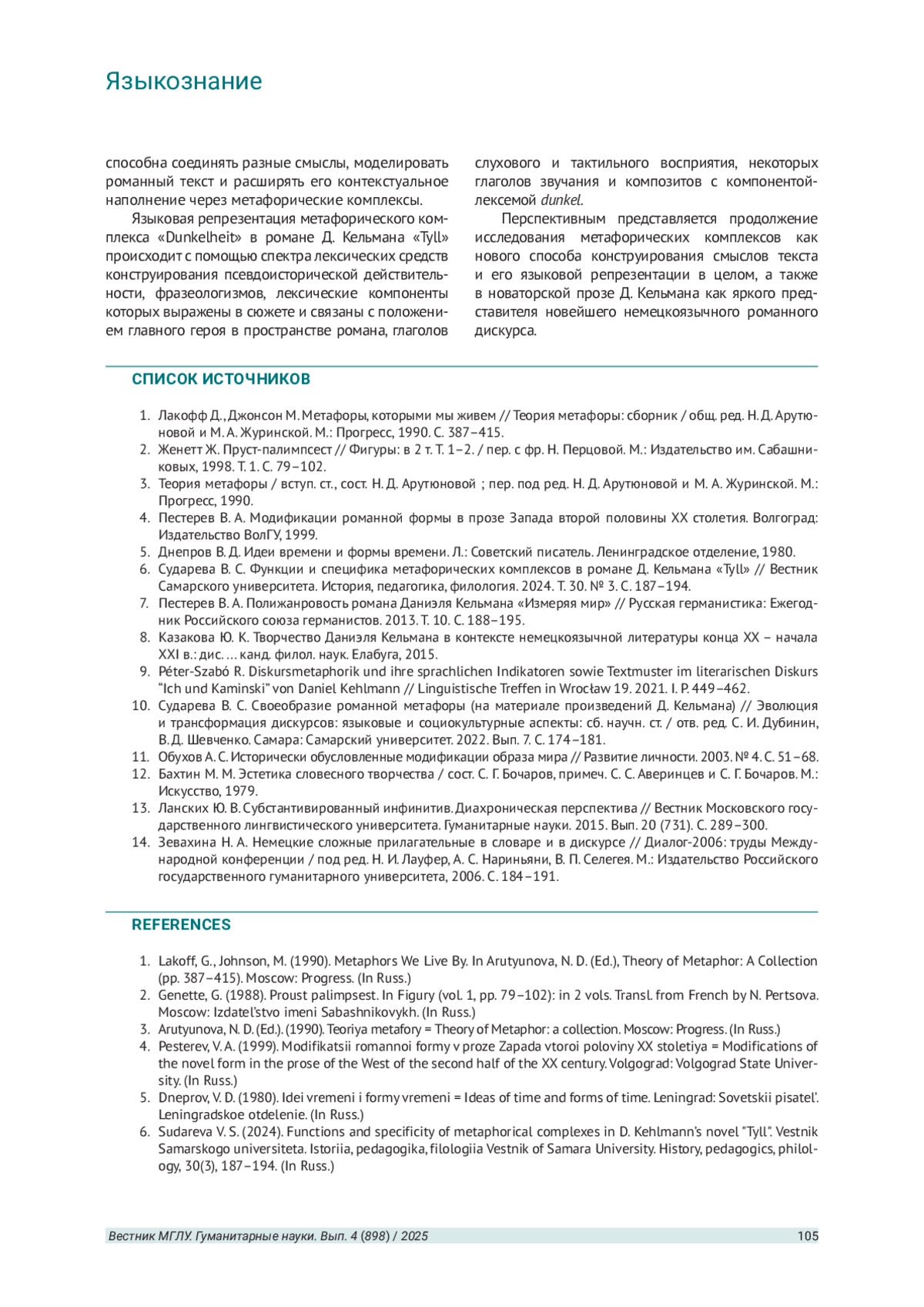 10. Сударева В. С. Своеобразие романной метафоры (на материале произведений Д. Кельмана) // Эволюция и трансформация дискурсов: языковые и социокультурные аспекты: сб. научн. ст. / отв. ред. С. И. Дубинин, В. Д. Шевченко. Самара: Самарский университет. 2022. Вып. 7. С. 174-181. EDN: EYSTIY
