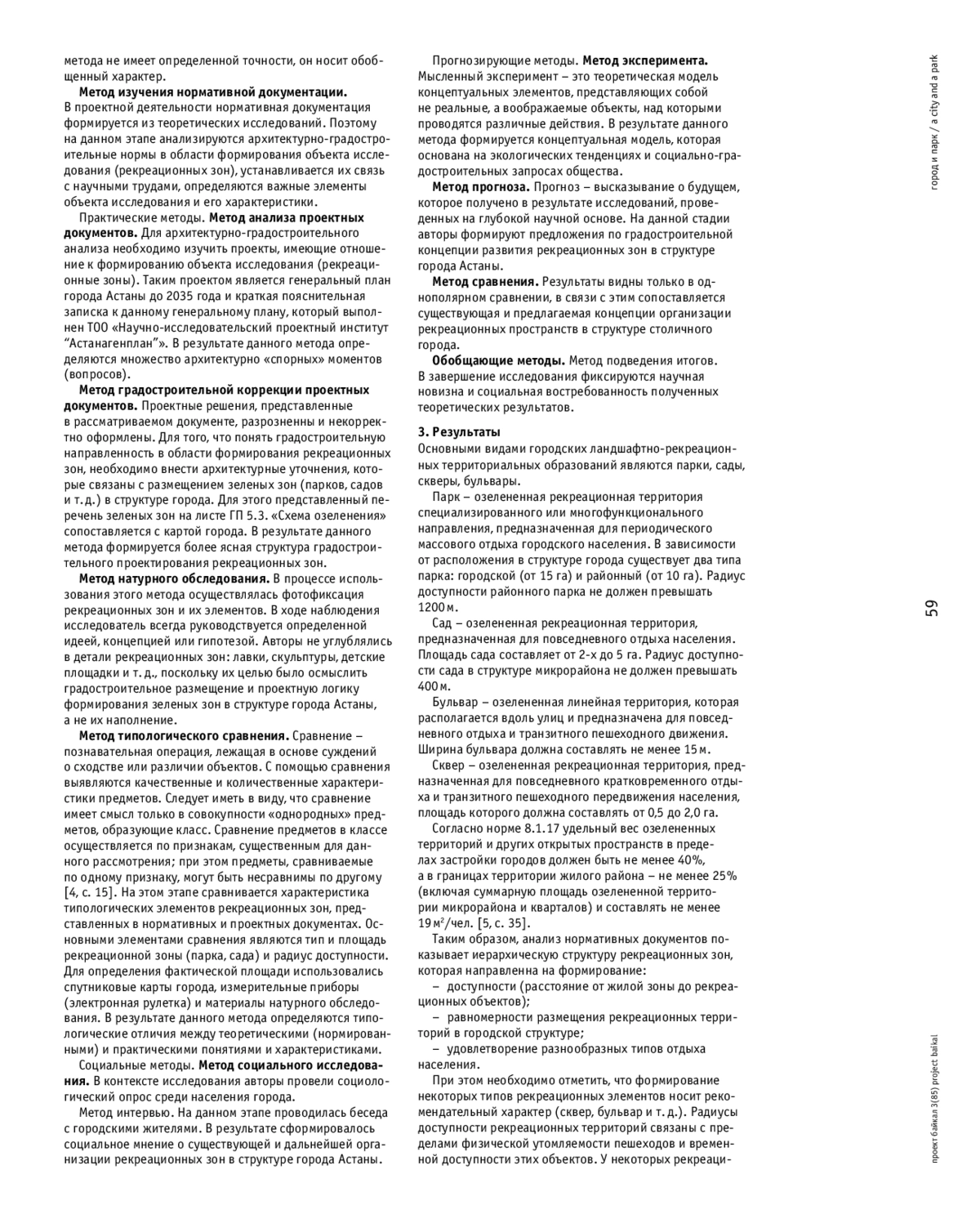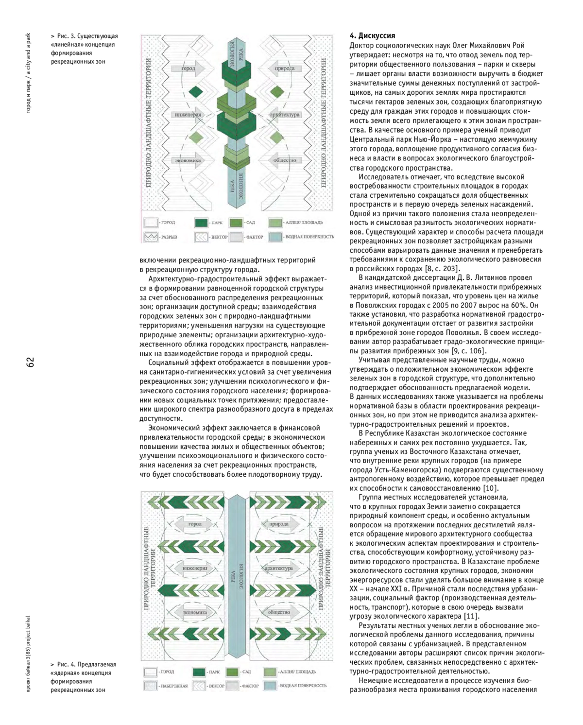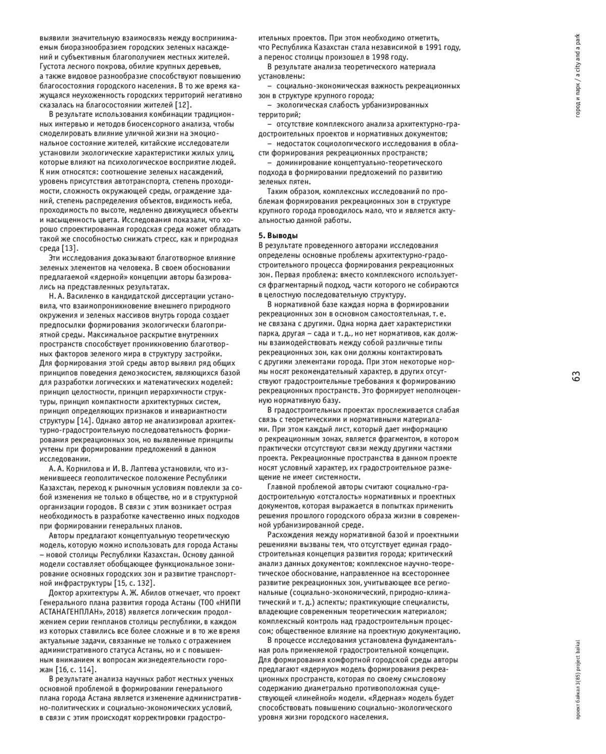 Формирование «зеленых каркасов» городов в XXI веке становится актуальной темой для определения их перспективного развития с позиции эколого-ориентированного подхода. Однако существующее неудовлетворительное эколого-гигиеническое состояние городов обусловлено рядом причин, вызванных процессами урбанизации: высокая плотность населения, большая площадь застройки и т. д. Эти проблемы в основном являются следствием архитектурно-градостроительных решений. В исследовании проводится анализ архитектурно-градостроительного процесса в проектировании рекреационных зон и выявляются проблемы в данной отрасли.