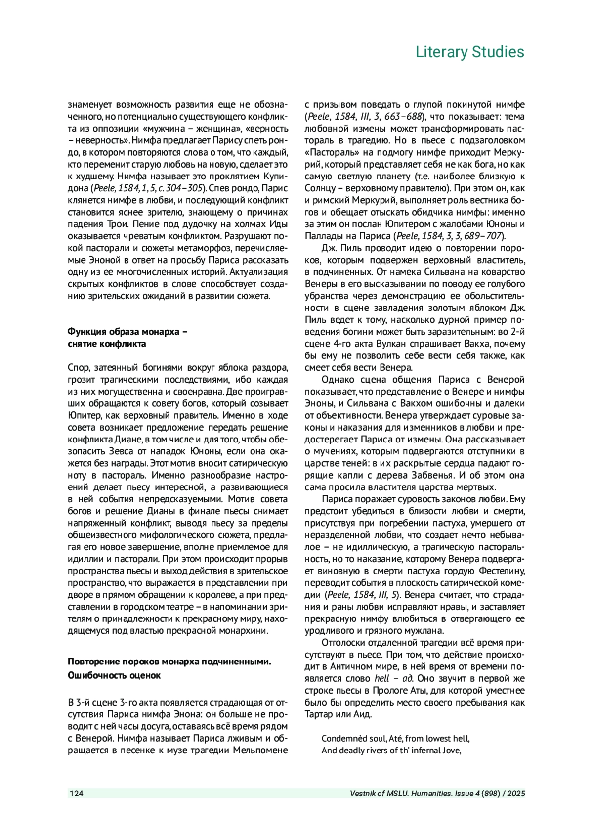 В статье рассмотрены элементы жанра придворной «маски» в пьесе Джорджа Пиля «Суд Париса» (١٥٨٤). Цель - вскрыть логику взаимодействия сферы придворного быта и области сценического искусства и определить специфику тональности анализируемой пьесы. Задачи - рассмотреть скрытые внутренние конфликтные оппозиции пасторали, лежащей в основе масочной культуры, как двигателя жанрового развития внешне бесконфликтной маски. В статье подчеркиваются такие функции маски, как восхваление монарха и создание эмблемы двора, в которой каждый участник видит и осознает свое место. Выявляются трагедийные и сатирические ноты пьесы-пасторали, оттенки которых характерны как сопутствующие для комедиографии рассматриваемого периода.