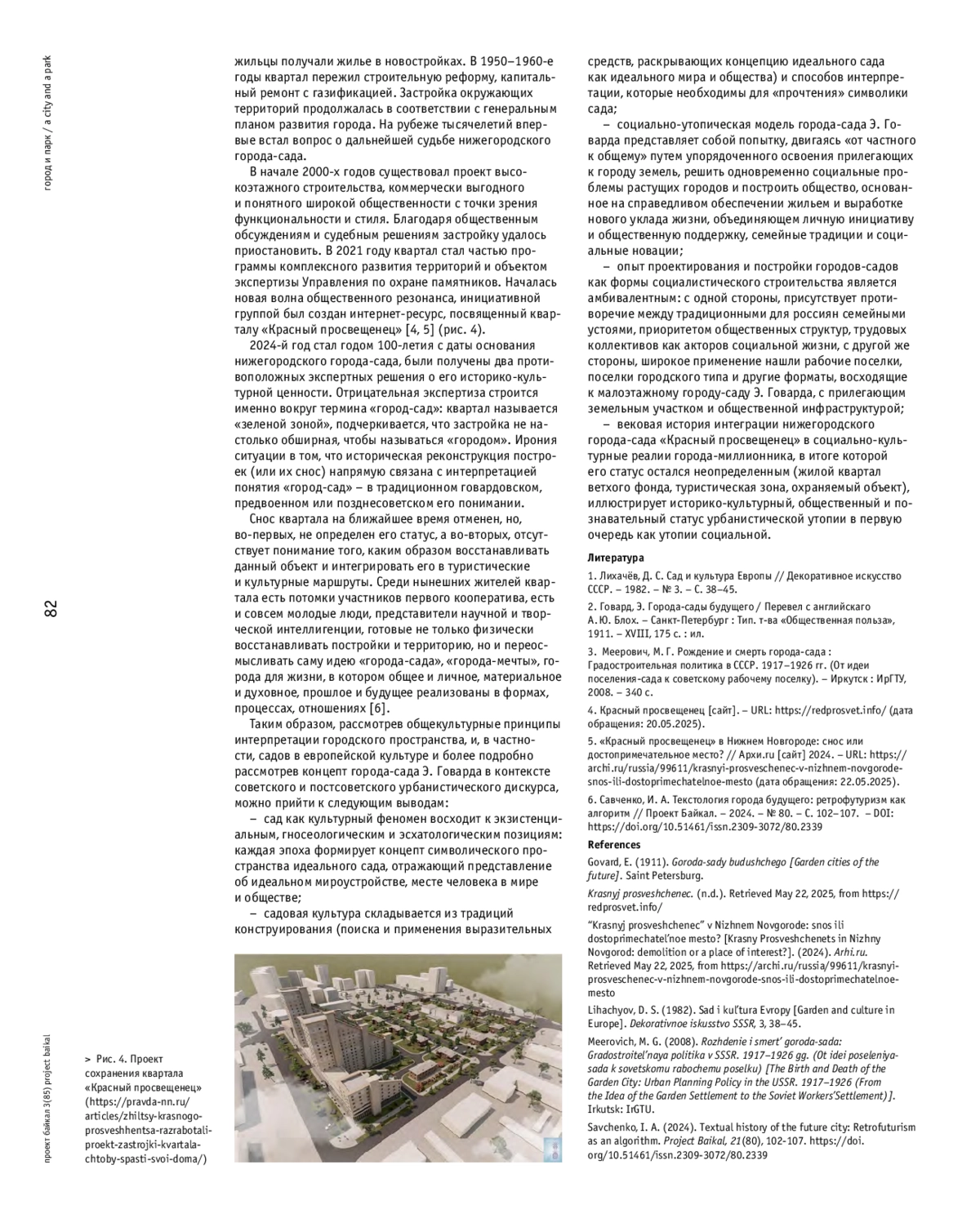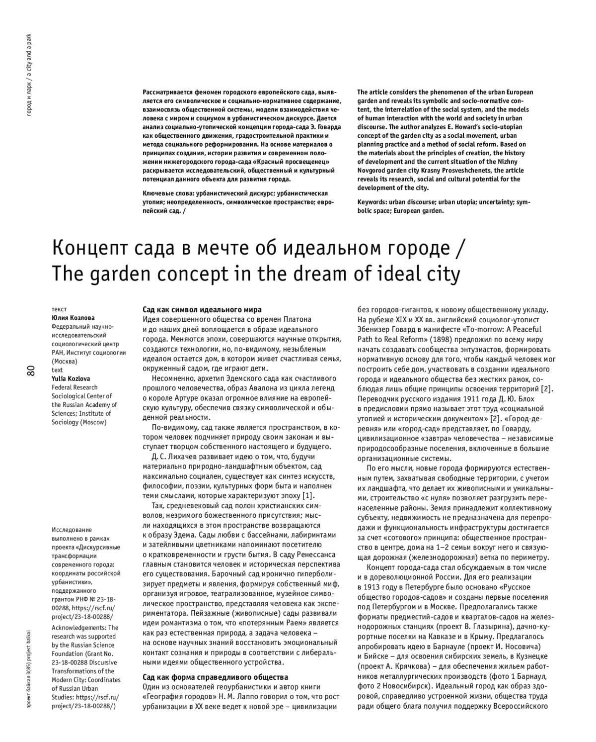 Рассматривается феномен городского европейского сада, выявляется его символическое и социально-нормативное содержание, взаимосвязь общественной системы, модели взаимодействия человека с миром и социумом в урбанистическом дискурсе. Дается анализ социально-утопической концепции города-сада Э. Говарда как общественного движения, градостроительной практики и метода социального реформирования. На основе материалов о принципах создания, истории развития и современном положении нижегородского города-сада «Красный просвещенец» раскрывается исследовательский, общественный и культурный потенциал данного объекта для развития города.