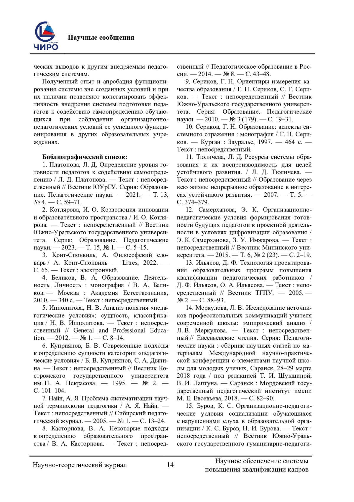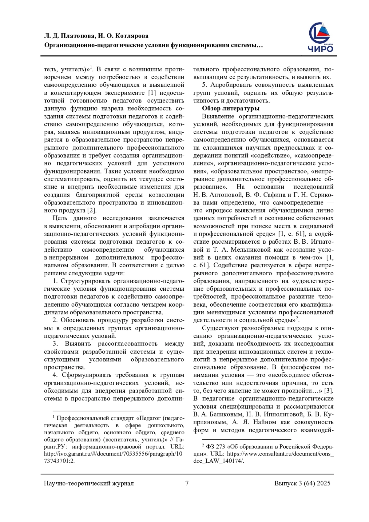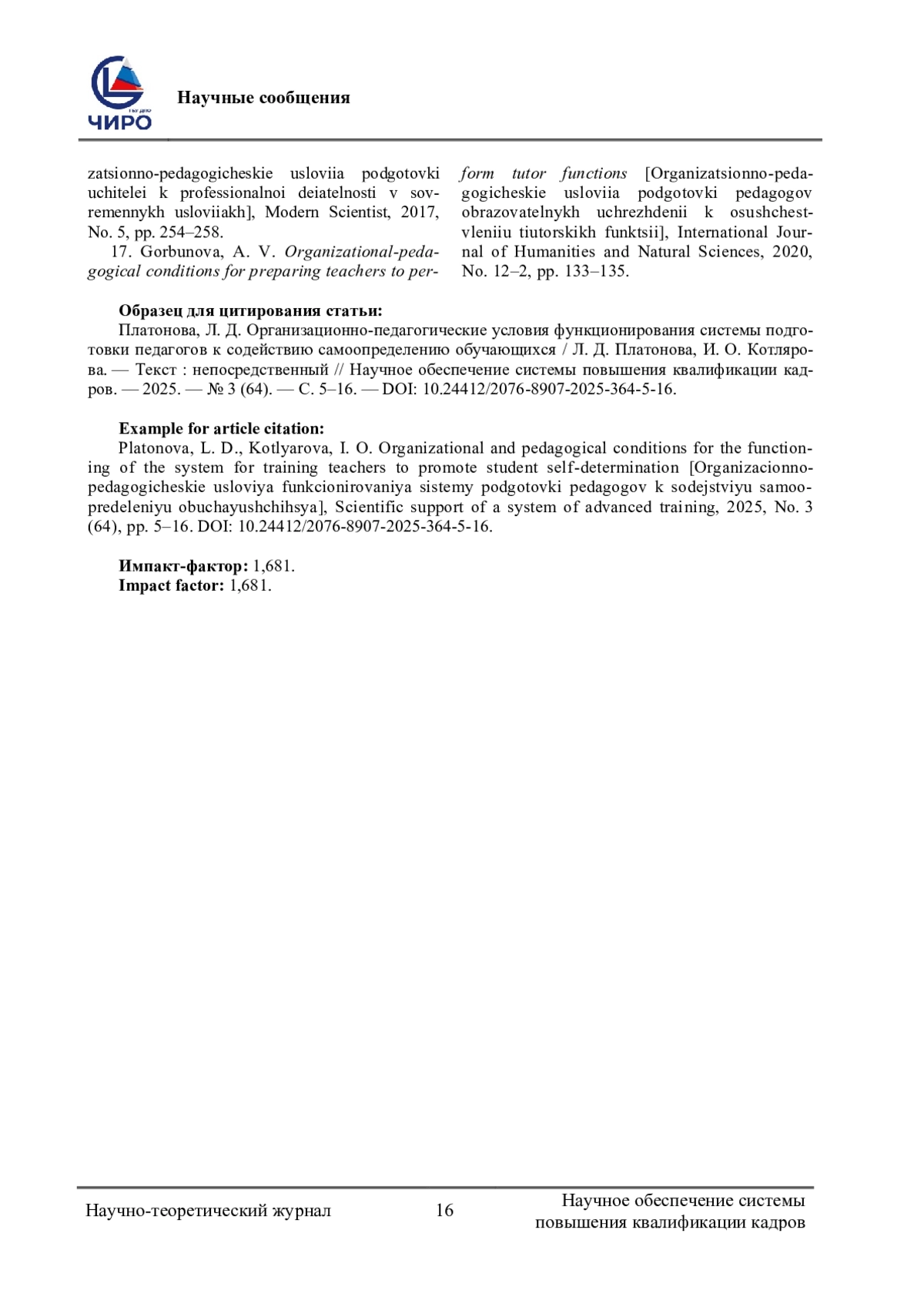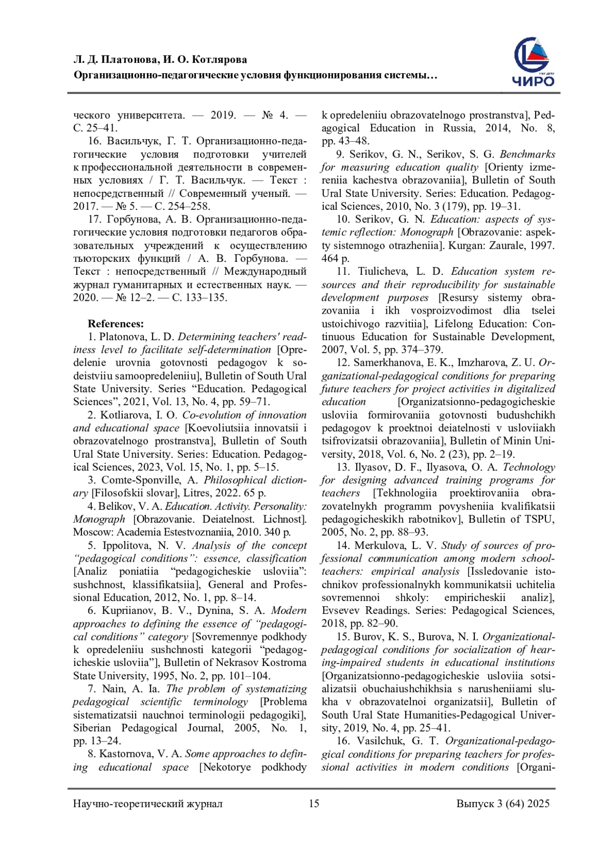 ПЛАТОНОВА Л.Д., КОТЛЯРОВА И. О. ОРГАНИЗАЦИОННО-ПЕДАГОГИЧЕСКИЕ УСЛОВИЯ ФУНКЦИОНИРОВАНИЯ СИСТЕМЫ ПОДГОТОВКИ ПЕДАГОГОВ К СОДЕЙСТВИЮ САМООПРЕДЕЛЕНИЮ ОБУЧАЮЩИХСЯ // НАУЧНОЕ ОБЕСПЕЧЕНИЕ СИСТЕМЫ ПОВЫШЕНИЯ КВАЛИФИКАЦИИ КАДРОВ. 2025. № 3 (64) (13 СТ.)