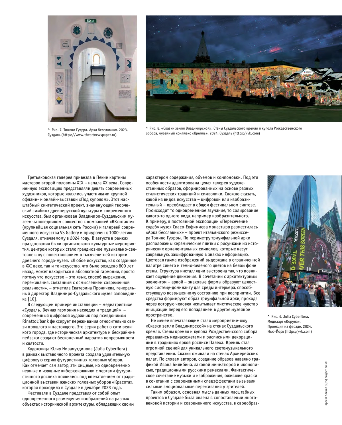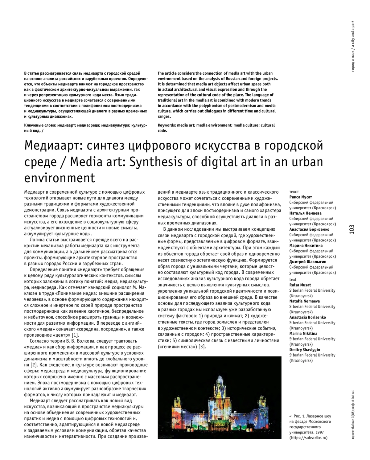 МУСАТ Р., НЕМАЕВА Н., БОРИСЕНКО А., НИКИТИНА М., ШАВЛЫГИН Д. МЕДИААРТ: СИНТЕЗ ЦИФРОВОГО ИСКУССТВА В ГОРОДСКОЙ СРЕДЕ // ПРОЕКТ БАЙКАЛ. 2025. № 85, ТОМ 22