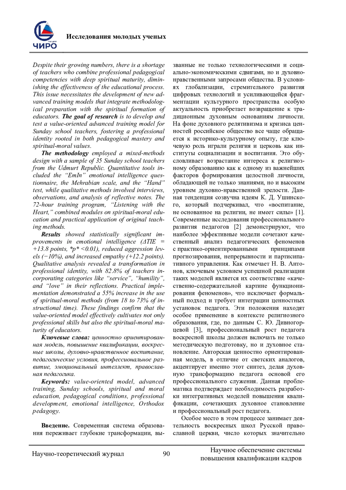 Проблема исследования и обоснование ее актуальности. Современная система образования, включая религиозное, сталкивается кризисом духовно-нравственных ориентиров, что особенно остро проявляется в деятельности воскресных школ. Несмотря на рост их количества, наблюдается дефицит педагогов, сочетающих профессиональные педагогические компетенции с глубокой духовной зрелостью, что снижает эффективность воспитательного процесса. Данная проблема требует разработки новых моделей повышения квалификации, интегрирующих методическую подготовку с духовным становлением педагога. Цель исследования. Разработка и апробация ценностно ориентированной модели повышения квалификации педагогов воскресных школ, направленной на формирование профессиональной идентичности, основанной на синтезе педагогического мастерства и духовно-нравственных ценностей. Методология (материалы и методы). Исследование проводилось на выборке из 35 педагогов воскресных школ Удмуртской Республики с использованием смешанного дизайна: количественные методы (опросник эмоционального интеллекта «ЭмИн», шкала Меграбяна, тест «Рука») и качественные (интервью, наблюдение, анализ рефлексивных заметок). Программа «Слушание сердцем» (72 академических часа) включала модули по духовно-нравственному воспитанию и практической апробации авторских методик. Результаты. Участники продемонстрировали статистически значимый рост эмоционального интеллекта (ΔОЭИ = +13,8 балла, p<0,01), снижение уровня агрессии (-10%) и увеличение эмпатийности (+12,2 балла). Качественный анализ выявил трансформацию профессиональной идентичности: 82,8% педагогов использовали в рефлексиях категории «служение», «смирение», «любовь». Практическая апробация показала увеличение использования духовно-нравственных методов на 55% (с 18 до 73% учебного времени). Результаты подтверждают, что ценностно ориентированная модель эффективно формирует не только профессиональные навыки, но и духовно-нравственную зрелость педагога.