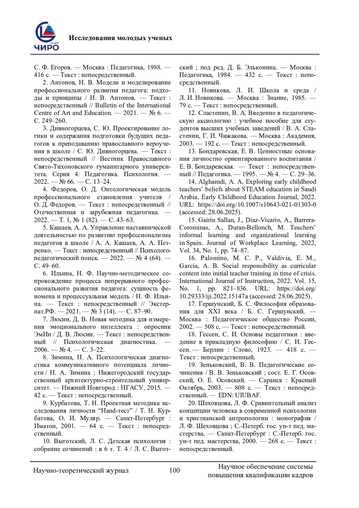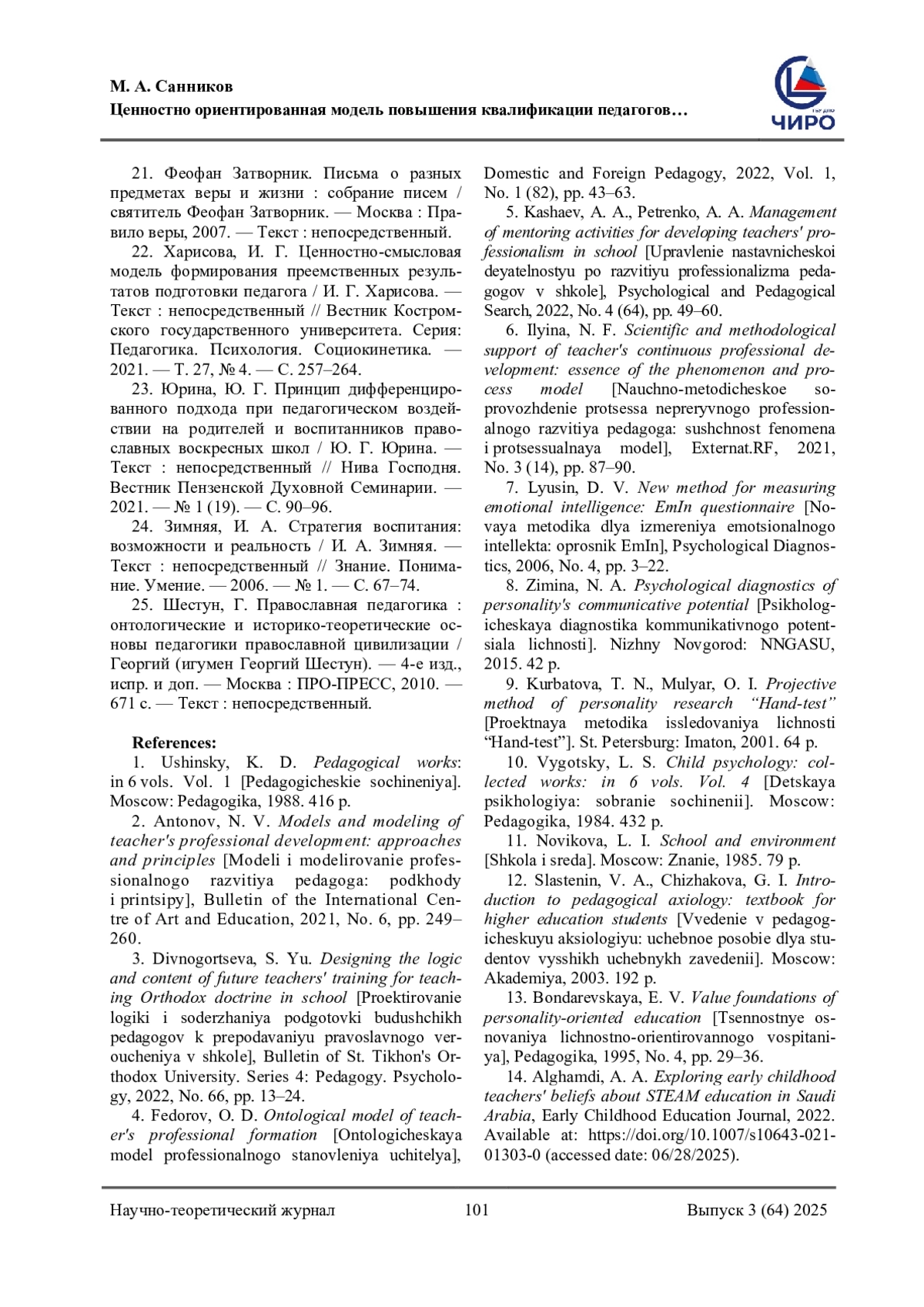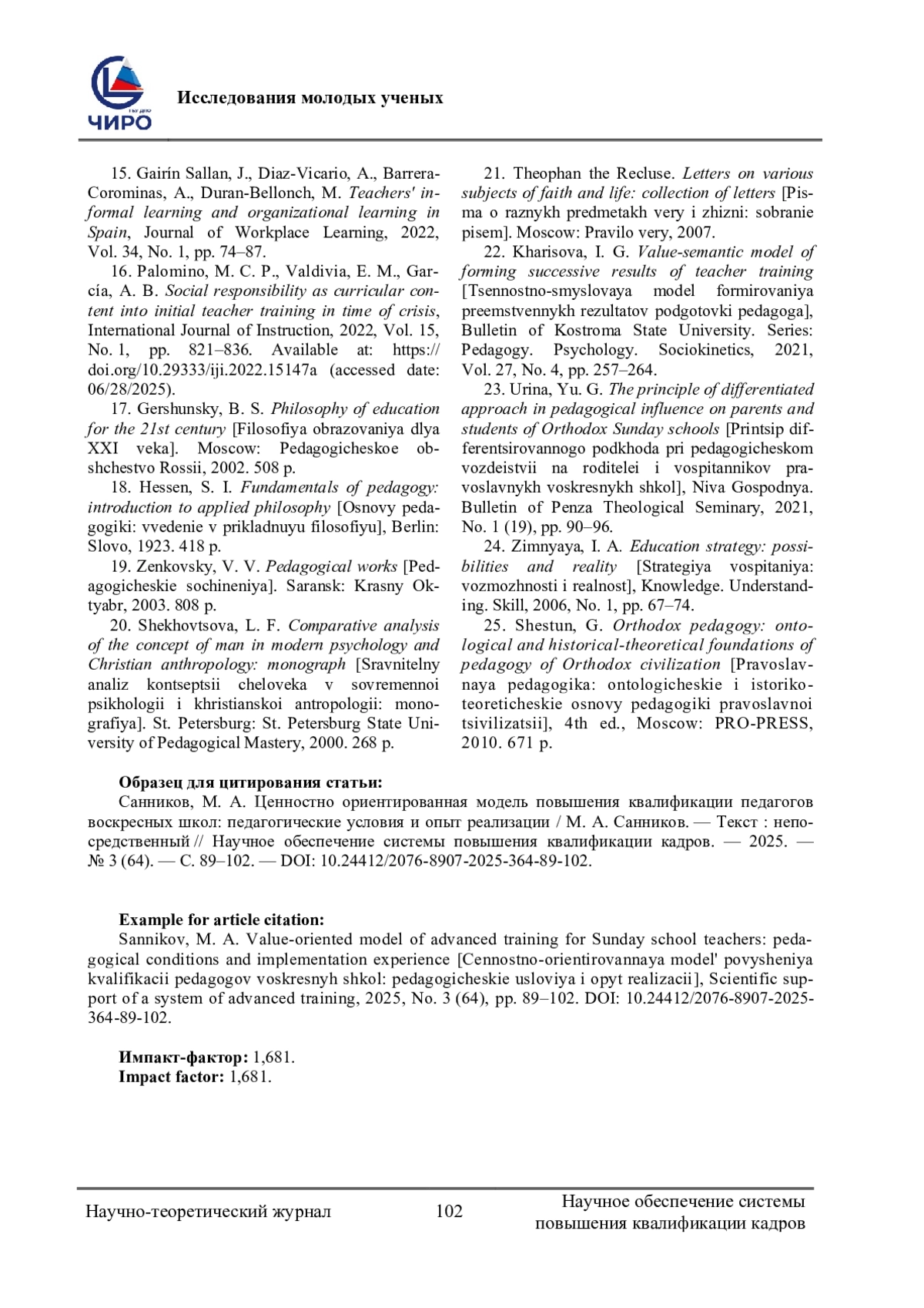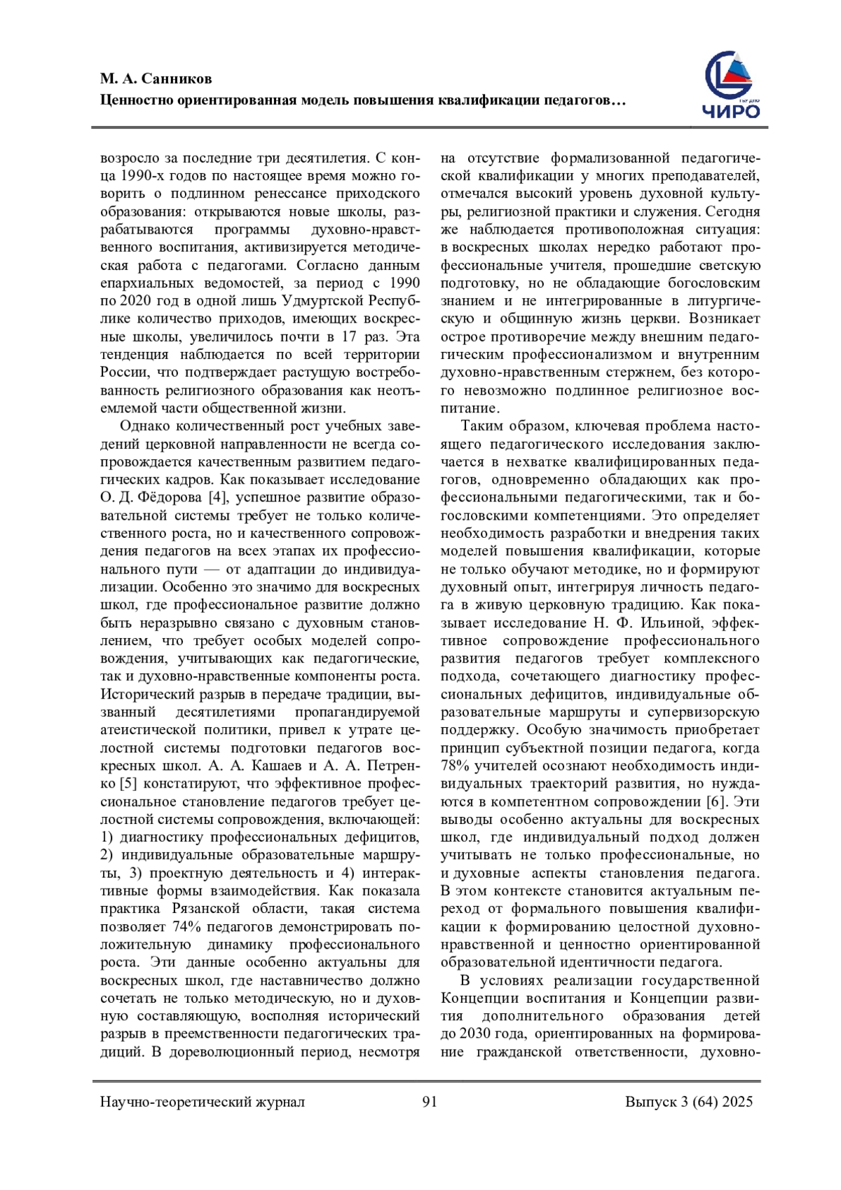 САННИКОВ М. А. ЦЕННОСТНО ОРИЕНТИРОВАННАЯ МОДЕЛЬ ПОВЫШЕНИЯ КВАЛИФИКАЦИИ ПЕДАГОГОВ ВОСКРЕСНЫХ ШКОЛ: ПЕДАГОГИЧЕСКИЕ УСЛОВИЯ И ОПЫТ РЕАЛИЗАЦИИ // НАУЧНОЕ ОБЕСПЕЧЕНИЕ СИСТЕМЫ ПОВЫШЕНИЯ КВАЛИФИКАЦИИ КАДРОВ. 2025. № 3 (64) (13 СТ.)