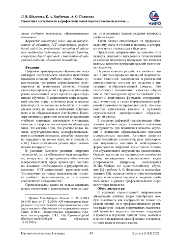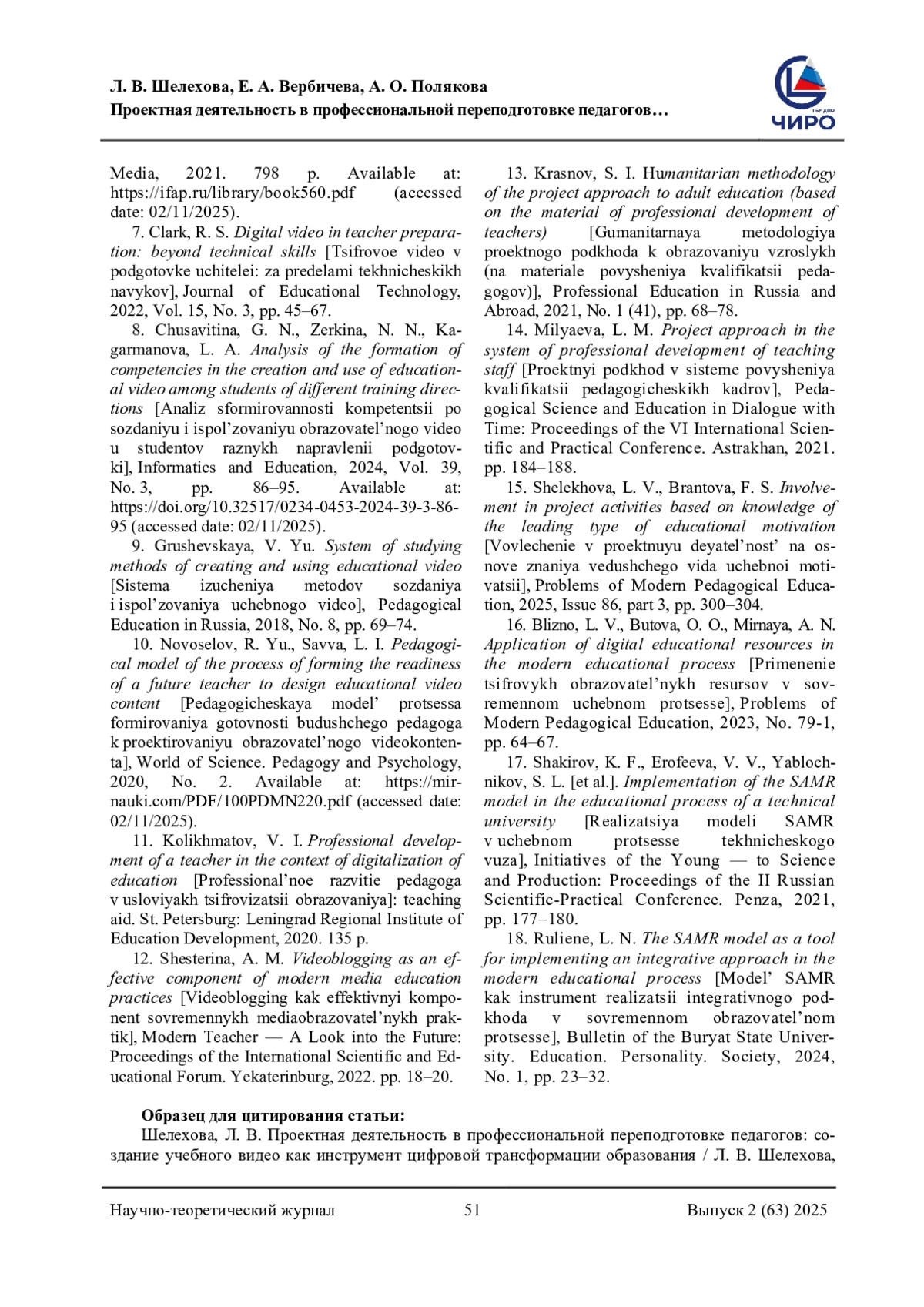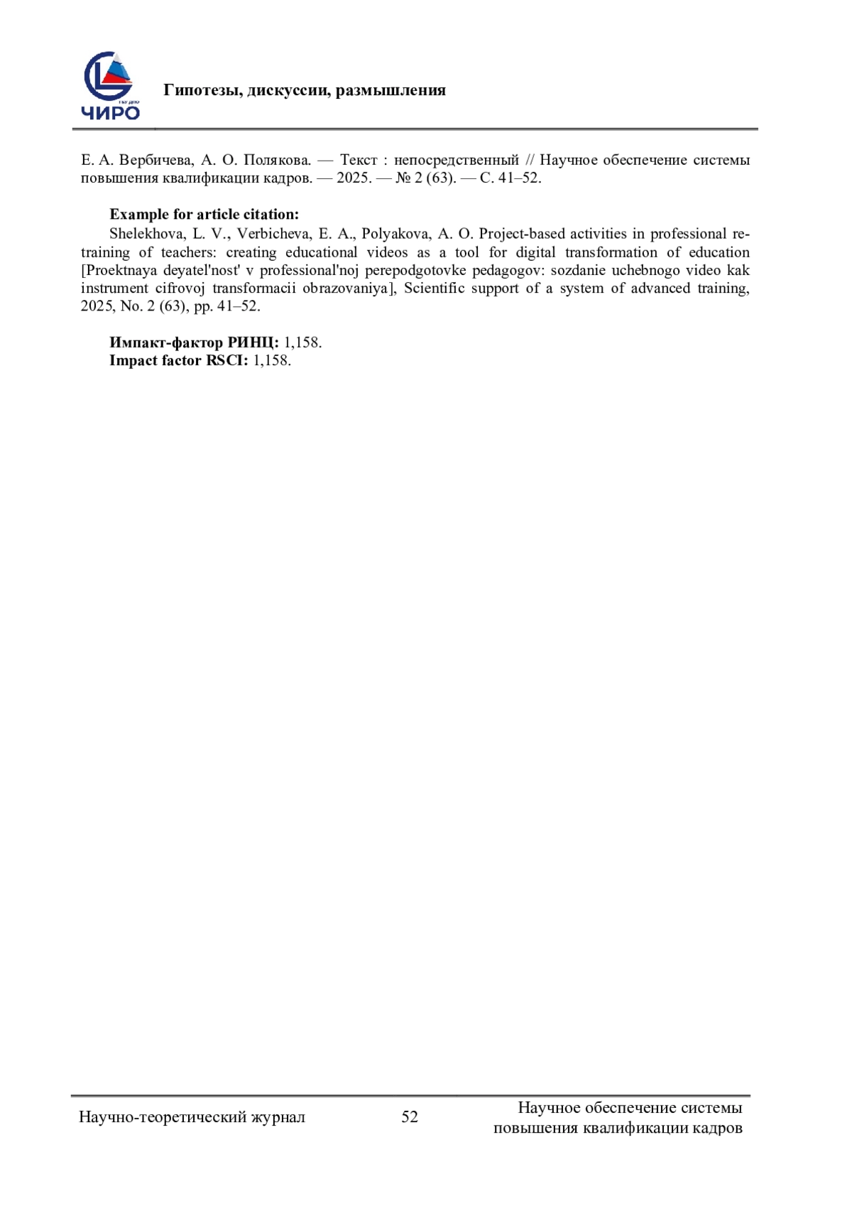 ШЕЛЕХОВА Л. В., ВЕРБИЧЕВА Е.А., ПОЛЯКОВА А.О. ПРОЕКТНАЯ ДЕЯТЕЛЬНОСТЬ В ПРОФЕССИОНАЛЬНОЙ ПЕРЕПОДГОТОВКЕ ПЕДАГОГОВ: СОЗДАНИЕ УЧЕБНОГО ВИДЕО КАК ИНСТРУМЕНТ ЦИФРОВОЙ ТРАНСФОРМАЦИИ ОБРАЗОВАНИЯ // НАУЧНОЕ ОБЕСПЕЧЕНИЕ СИСТЕМЫ ПОВЫШЕНИЯ КВАЛИФИКАЦИИ КАДРОВ. 2025. № 2 (63) (14 СТ.)