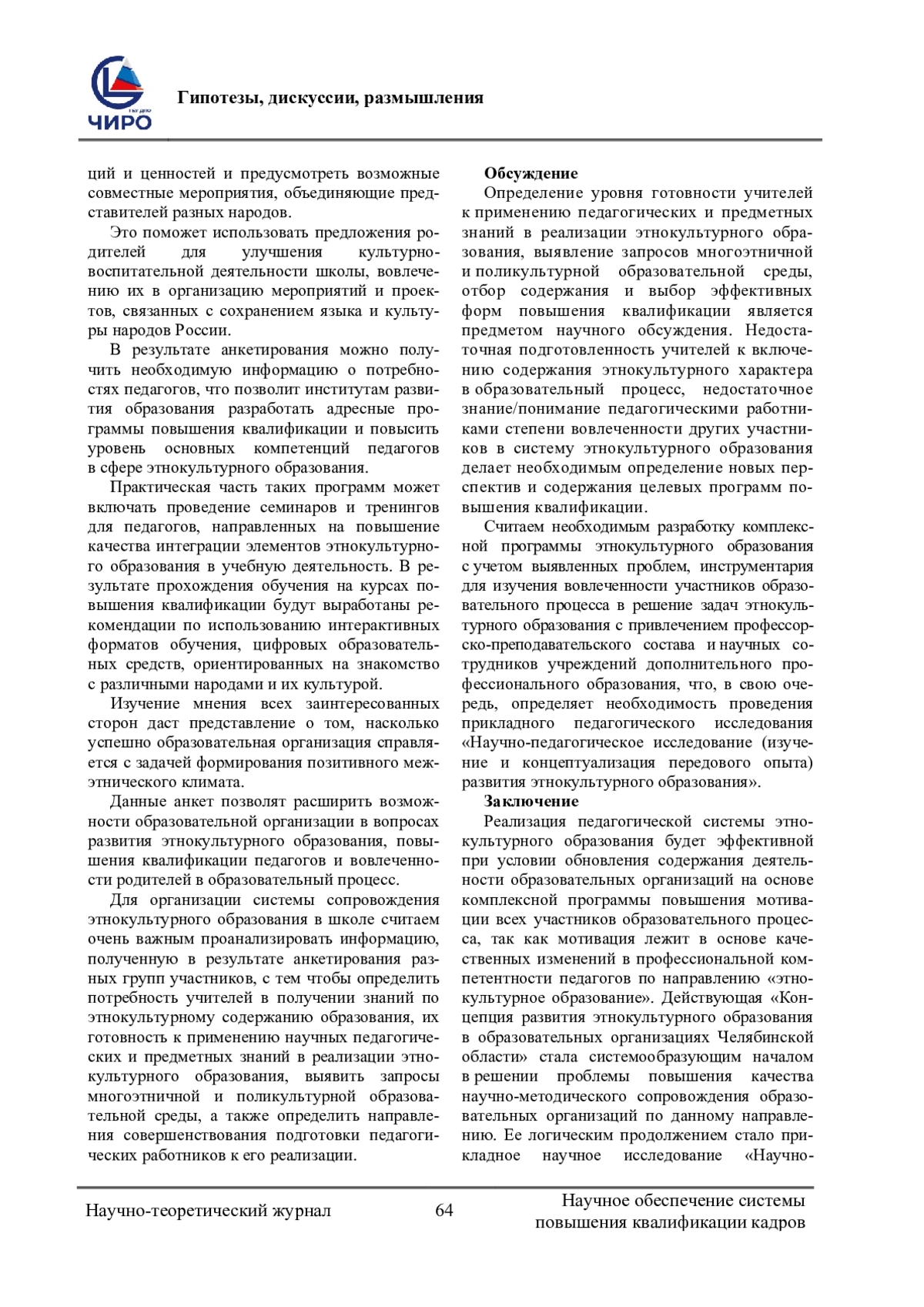 Проблема исследования и обоснование ее актуальности. Актуальность исследования определяется генеральной целью, стоящей перед российским обществом, - формирование национальной суверенной системы образования, единой системы воспитания, что определяет возрастающую роль этнокультурного образования в современной образовательной системе как одного из ведущих средств формирования мировоззрения, воспитания и социально-педагогической поддержки становления и развития гражданина России и делает необходимым повышение результативности работы педагогических коллективов по этнокультурному образованию, совершенствование психолого-педагогических, культурологических, исторических, лингвистических, литературоведческих знаний учителей общеобразовательных школ, а также научно-методическое сопровождение со стороны научных специалистов института развития образования, направленное на совершенствование профессиональных компетенций различных категорий педагогических работников в сфере этнокультурного образования. Цель исследования - выявить основные достижения и проблемы в реализации задач этнокультурного образования в общеобразовательной школе на основе изучения эффективных социокультурных практик (на примере Челябинской области), разработать комплекс мер научно-методического сопровождения, способствующего повышению профессиональных компетенций педагогических работников в сфере этнокультурного образования, разработать инструментарий, позволяющий выявить степень вовлеченности участников образовательного процесса в процесс этнокультурного образования, готовности учителей к применению педагогических и предметных знаний в реализации этнокультурного образования, сформированность запросов многоэтничной и поликультурной образовательной среды. Методология (материалы и методы). Исследование осуществлялось на основе системного, компетентностного, личностно ориентированного подходов к проектированию содержания и реализации этнокультурного образования. Исследование проводится с применением методов анализа и синтеза информации нормативного характера, эмпирических и статистических данных, полученных в результате изучения практики реализации этнокультурного образования и проведения анкетирования участников образовательного процесса (педагогических работников, учащихся, родителей) с целью изучения готовности участников образовательного процесса к освоению этнокультурного содержания образования. Результаты исследования связаны с проведением прикладного научного исследования, в процессе которого осуществляется разработка, теоретическое обоснование и апробация системы реализации этнокультурного образования и использования эффективных педагогических инструментов в процессе социокультурных практик. Результаты исследования имеют практическую значимость и могут быть использованы при проектировании и реализации этнокультурного образования в общеобразовательной школе, в рамках курсовой подготовки в условиях института развития образования, а также при планировании и реализации иных форм повышения квалификации педагогических работников, в том числе неформальных и информальных. Научная новизна заключается в определении оснований разработки системы подготовки учителей к реализаци