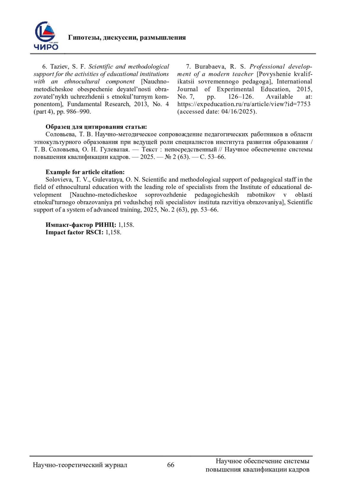 7. Бурабаева, Р. С. Повышение квалификации современного педагога / Р. С. Бурабаева. - Текст: непосредственный // Международный журнал экспериментального образования. - 2015. - № 7. - С. 126. EDN: TUAFVJ