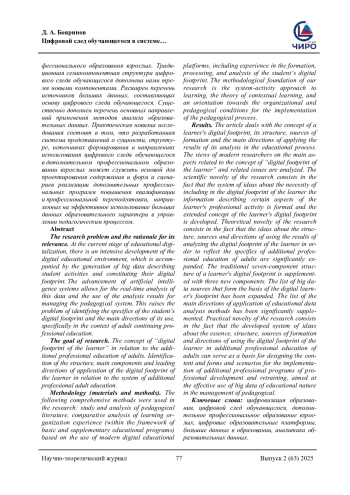 Проблема исследования и обоснование ее актуальности. На современном этапе процесса цифровизации образования происходит интенсивное развитие цифрового образовательного пространства, что сопровождается генерацией больших данных, описывающих действия обучающегося и составляющие его цифровой след. Развитие систем искусственного интеллекта позволяет анализировать эти данные в режиме реального времени и использовать результаты анализа для управления педагогической системой. Возникает проблема выявления специфики цифрового следа обучающегося и основных направлений его использования применительно к системе дополнительного профессионального образования взрослых. Цель исследования. Определение содержания понятия «цифровой след обучающегося» применительно к дополнительному профессиональному образованию взрослых. Выявление структуры, основных компонентов и ведущих направлений применения цифрового следа обучающегося применительно к системе дополнительного профессионального образования взрослых. Методология (материалы и методы) В исследовании были использованы следующие комплексные методы: изучение и анализ педагогической литературы, сравнительный анализ опыта организации обучения (в рамках основных и дополнительных учебных программ), основанного на использовании современных цифровых образовательных платформ, в том числе опыта формирования, обработки и анализа цифрового следа обучающегося. Методологической основой нашего исследования является системно-деятельностный подход в обучении, теория контекстного обучения и ориентация на организационно-педагогические условия реализации педагогического процесса. Результаты. В статье рассматриваются понятие цифрового следа обучающегося, его структура, источники формирования и основные направления применения результатов его анализа в учебном процессе. Анализируются взгляды современных исследователей на основные аспекты, связанные с понятием «цифровой след обучающегося» и связанные с ними вопросы. Научная новизна исследования состоит в том, что сформирована система представлений о необходимости включения в цифровой след обучающегося информации, описывающей отдельные аспекты профессиональной деятельности обучающегося и разработано расширенное понятие цифрового следа обучающегося. Теоретическая новизна исследования состоит в том, что существенно расширены представления о структуре, источниках и направлениях использования результатов анализа цифрового следа обучающегося с целью отражения специфики дополнительного профессионального образования взрослых. Традиционная семикомпонентная структура цифрового следа обучающегося дополнена нами тремя новыми компонентами. Расширен перечень источников больших данных, составляющих основу цифрового следа обучающегося. Существенно дополнен перечень основных направлений применения методов анализа образовательных данных. Практическая новизна исследования состоит в том, что разработанная система представлений о сущности, структуре, источниках формирования и направлениях использования цифрового следа обучающегося в дополнительном профессиональном образовании взрослых может служить основой для проектирования содержания и форм и сценариев реализации дополнительных профессиональных п