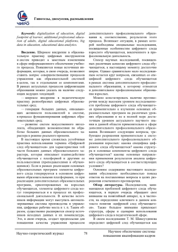 Ключевые фразы: ЦИФРОВИЗАЦИЯ ОБРАЗОВАНИЯ, цифровой след обучающегося, дополнительное профессиональное образование взрослых, цифровые образовательные платформы, большие данные в образовании, аналитика образовательных данных