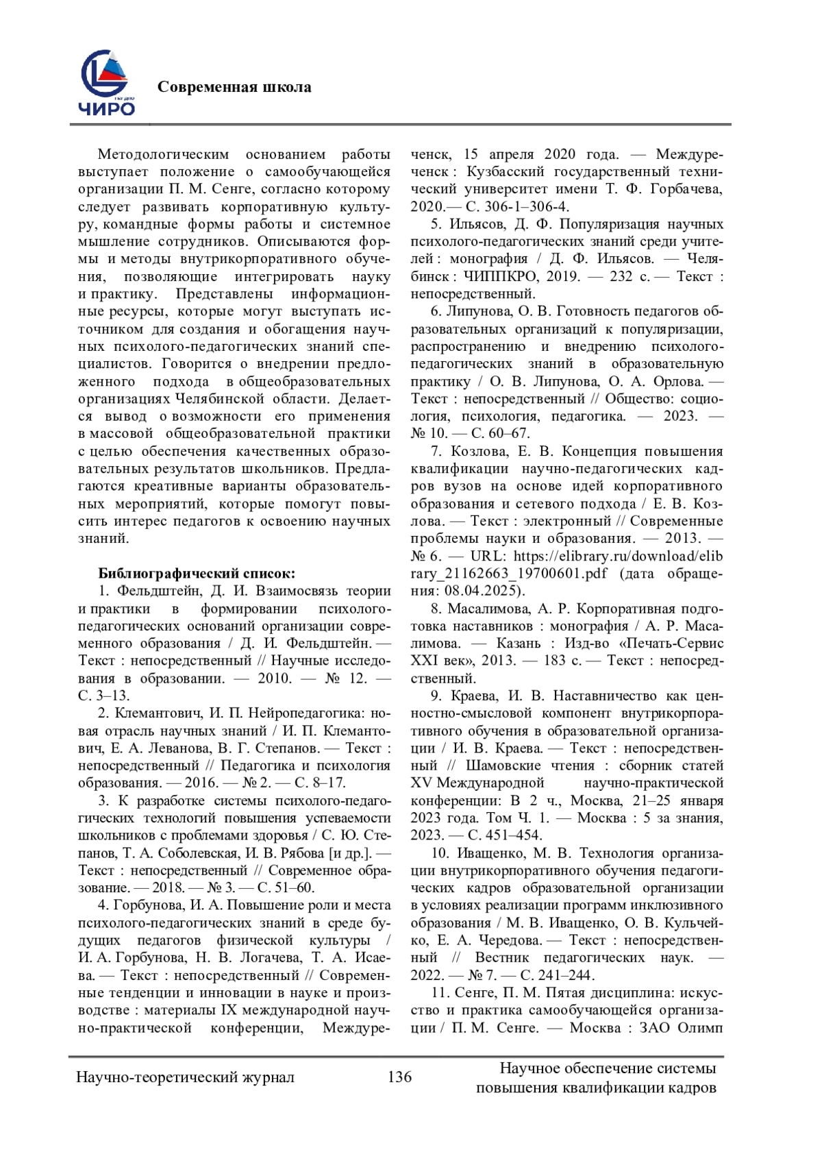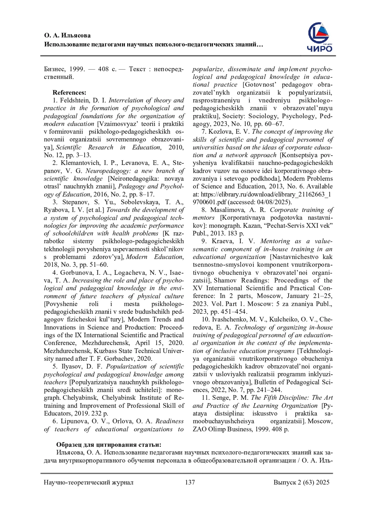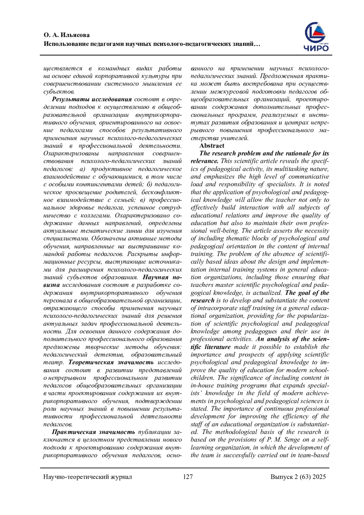 ИЛЬЯСОВА О. А. ИСПОЛЬЗОВАНИЕ ПЕДАГОГАМИ НАУЧНЫХ ПСИХОЛОГО-ПЕДАГОГИЧЕСКИХ ЗНАНИЙ КАК ЗАДАЧА ВНУТРИКОРПОРАТИВНОГО ОБУЧЕНИЯ ПЕРСОНАЛА В ОБЩЕОБРАЗОВАТЕЛЬНОЙ ОРГАНИЗАЦИИ // НАУЧНОЕ ОБЕСПЕЧЕНИЕ СИСТЕМЫ ПОВЫШЕНИЯ КВАЛИФИКАЦИИ КАДРОВ. 2025. № 2 (63) (14 СТ.)