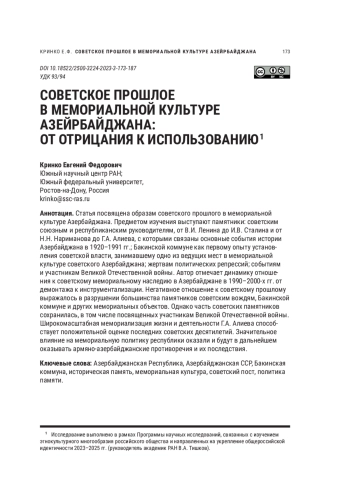 Статья посвящена образам советского прошлого в мемориальной культуре Азербайджана. Предметом изучения выступают памятники: советским союзным и республиканским руководителям, от В. И. Ленина до И. В. Сталина и от Н. Н. Нариманова до Г. А. Алиева, с которыми связаны основные события истории Азербайджана в 1920–1991 гг.; Бакинской коммуне как первому опыту установления советской власти, занимавшему одно из ведущих мест в мемориальной культуре советского Азербайджана; жертвам политических репрессий; событиям и участникам Великой Отечественной войны. Автор отмечает динамику отношения к советскому мемориальному наследию в Азербайджане в 1990–2000-х гг. от демонтажа к инструментализации. Негативное отношение к советскому прошлому выражалось в разрушении большинства памятников советским вождям, Бакинской коммуне и других мемориальных объектов. Однако часть советских памятников сохранилась, в том числе посвященных участникам Великой Отечественной войны. Широкомасштабная мемориализация жизни и деятельности Г. А. Алиева способствует положительной оценке последних советских десятилетий. Значительное влияние на мемориальную политику республики оказали и будут в дальнейшем оказывать армяно-азербайджанские противоречия и их последствия