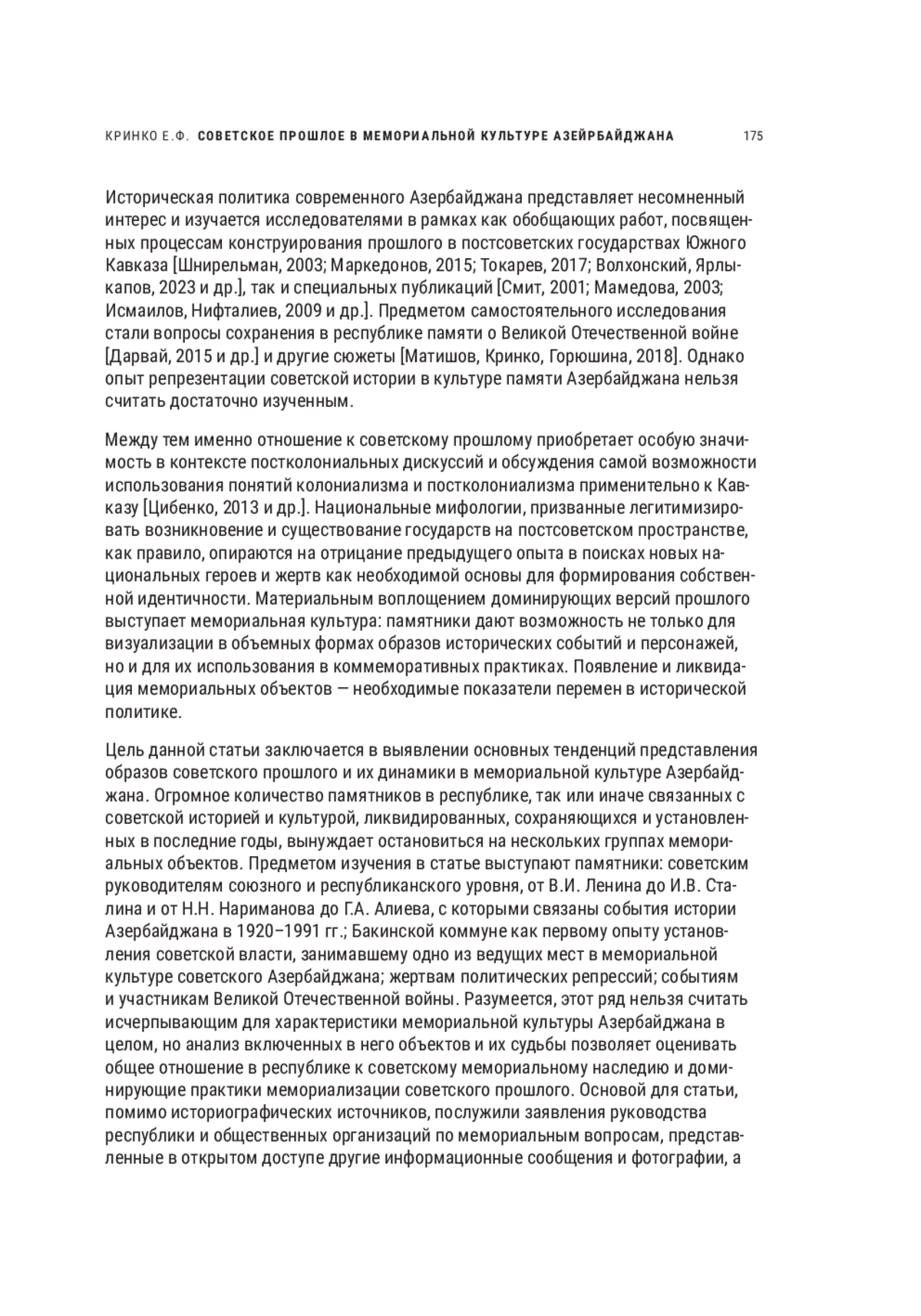 Историческая политика современного Азербайджана представляет несомненный интерес и изучается исследователями в рамках как обобщающих работ, посвященных процессам конструирования прошлого в постсоветских государствах Южного Кавказа [Шнирельман, 2003; Маркедонов, 2015; Токарев, 2017; Волхонский, Ярлыкапов, 2023 и др.], так и специальных публикаций [Смит, 2001; Мамедова, 2003; Исмаилов, Нифталиев, 2009 и др.]. Предметом самостоятельного исследования стали вопросы сохранения в республике памяти о Великой Отечественной войне [Дарвай, 2015 и др.] и другие сюжеты [Матишов, Кринко, Горюшина, 2018]. Однако опыт репрезентации советской истории в культуре памяти Азербайджана нельзя считать достаточно изученным.