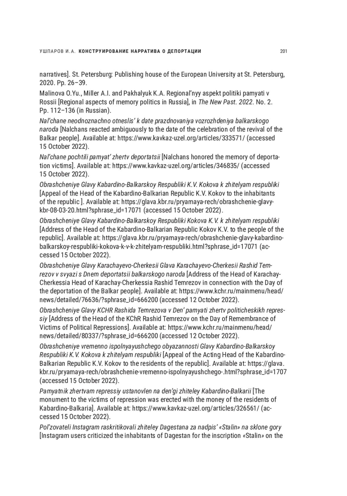 8. Депутаты Карачаево-Черкесии предложили ввести уголовное наказание за оправдание сталинских репрессий. URL: https://www.kavkaz-uzel.org/articles/285054/ (дата обращения - 13 октября 2022 г.).