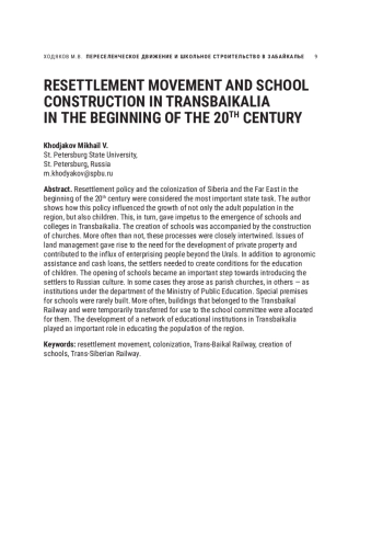 Переселенческая политика, колонизация Сибири и Дальнего Востока в начале XX в. считались важнейшей государственной задачей. Автор показывает, как эта политика влияла на рост численности в крае не только взрослого населения, но и детей. Это, в свою очередь, давало толчок возникновению школ и училищ, в том числе в Забайкалье. Создание школ сопровождалось строительством церквей. Чаще всего эти процессы были тесно переплетены. Вопросы землеустройства вызывали к жизни необходимость развития частной собственности, способствовали притоку предприимчивых деятелей за Урал. Помимо агрономической помощи и денежных ссуд переселенцам требовалось создать условия для обучения детей. Открытие школ становилось важным шагом на пути приобщения переселенцев к русской культуре. В одних случаях они возникали как церковно-приходские, в других — как учреждения, находившиеся в ведомстве министерства народного просвещения. Специальные помещения для школ строились редко. Чаще под них отводились здания, принадлежавшие Забайкальской железной дороге и временно переданные в пользование школьному комитету. Развитие сети учебных заведений в Забайкалье сыграло важную роль в просвещении населения края