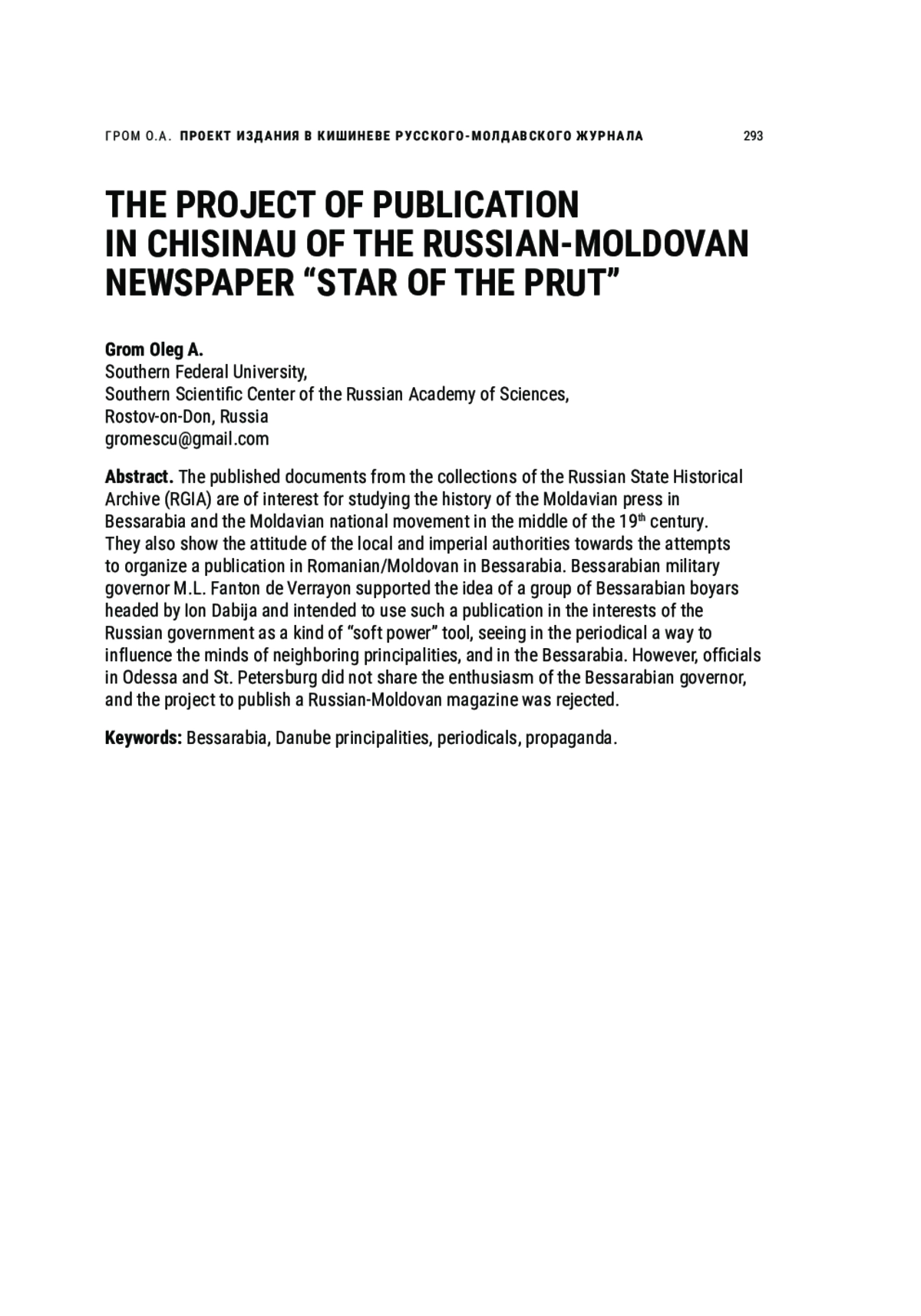 ГРОМ О. А. ПРОЕКТ ИЗДАНИЯ В КИШИНЕВЕ РУССКОГО-МОЛДАВСКОГО ЖУРНАЛА "ЗВЕЗДОЧКА ПРУТА" // НОВОЕ ПРОШЛОЕ. 2023. № 4