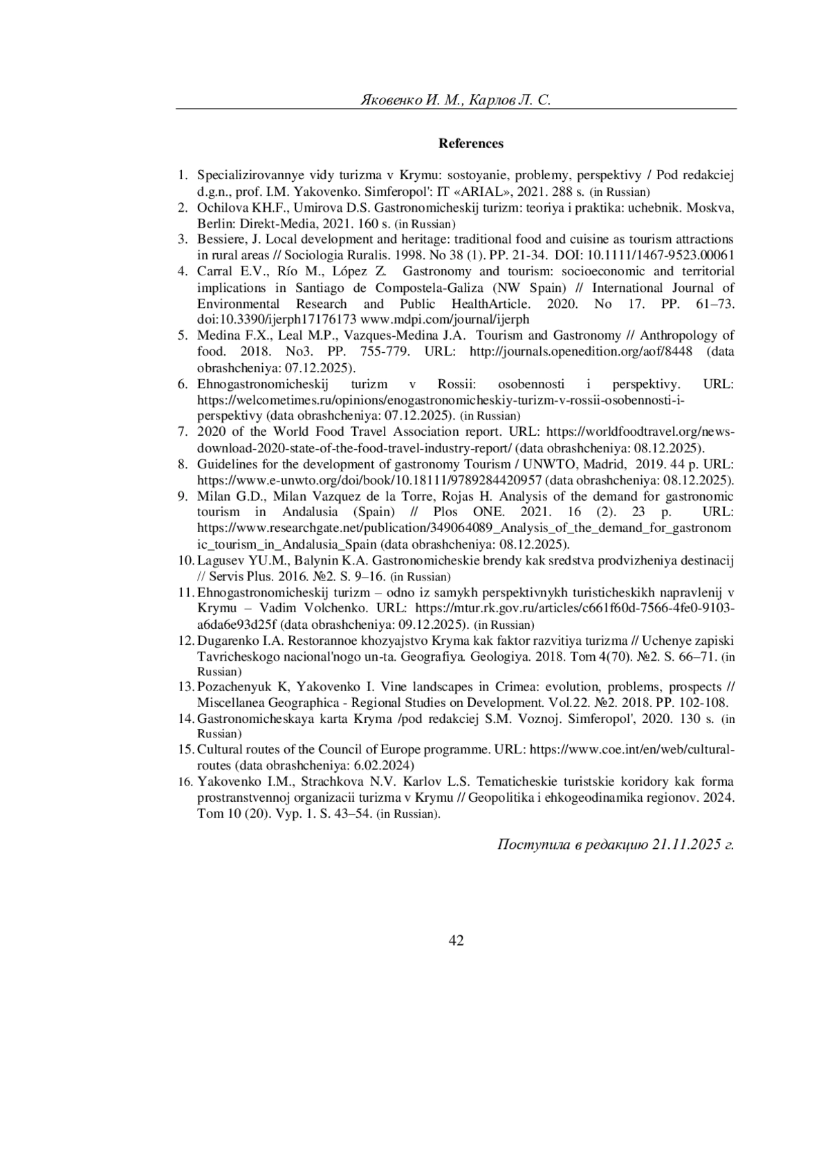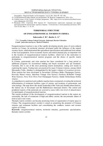 ЯКОВЕНКО И. М., КАРЛОВ Л. С. ТЕРРИТОРИАЛЬНАЯ СТРУКТУРА ЭНОГАСТРОНОМИЧЕСКОГО ТУРИЗМА В КРЫМУ // УЧЕНЫЕ ЗАПИСКИ КРЫМСКОГО ФЕДЕРАЛЬНОГО УНИВЕРСИТЕТА ИМЕНИ В. И. ВЕРНАДСКОГО. ГЕОГРАФИЯ. ГЕОЛОГИЯ. 2025. ТОМ 11 (77). № 4