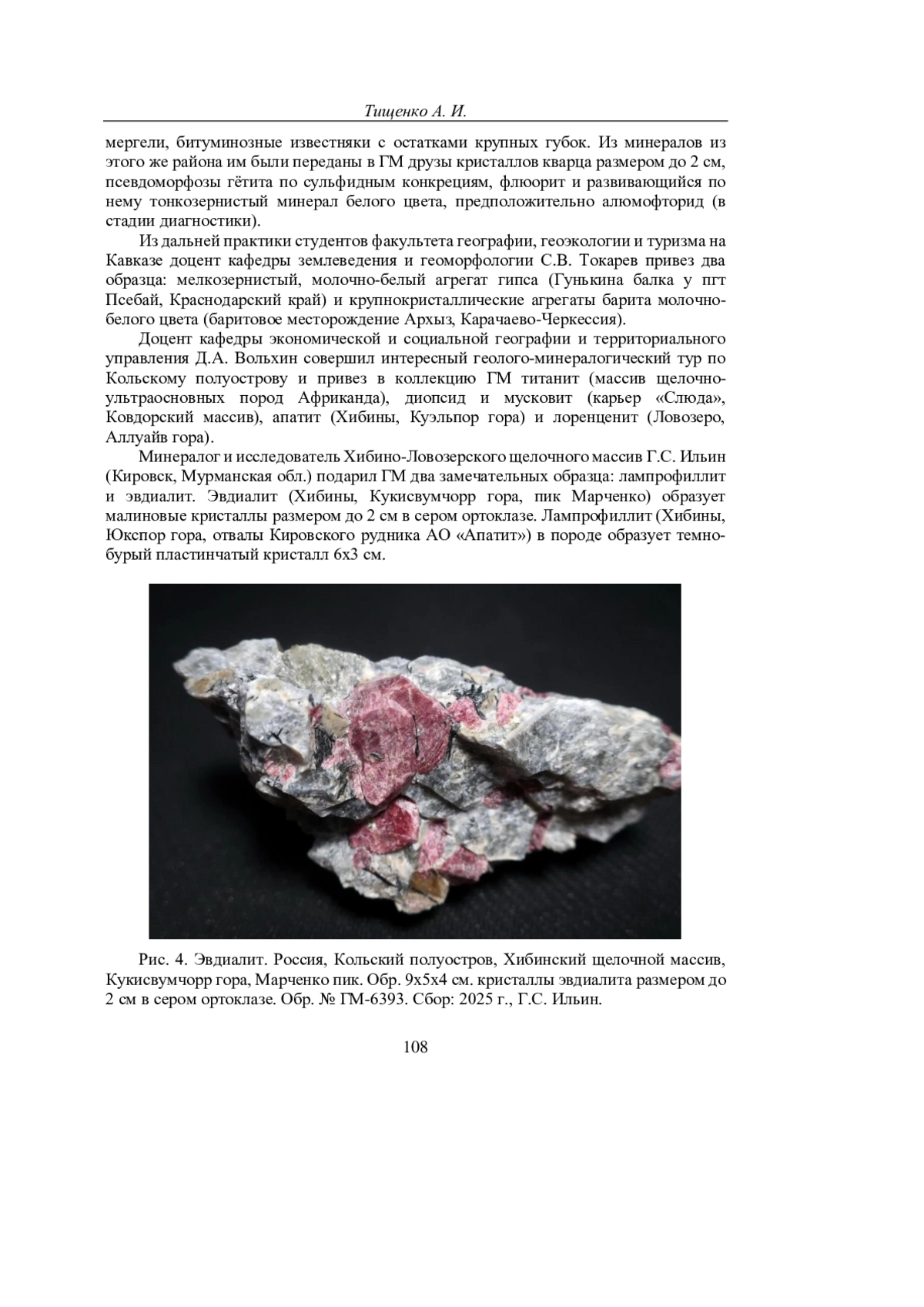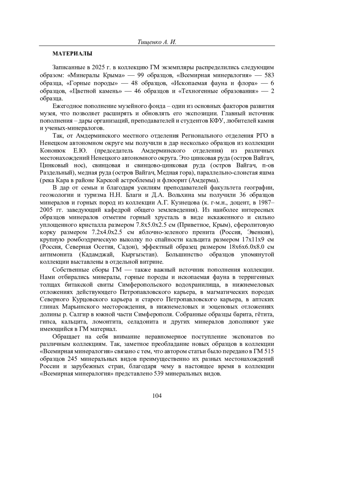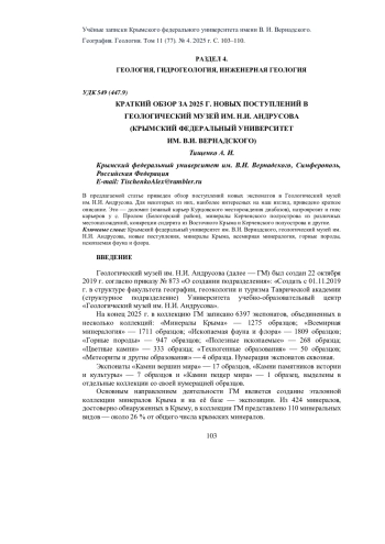 ТИЩЕНКО А. И. КРАТКИЙ ОБЗОР ЗА 2025 Г. НОВЫХ ПОСТУПЛЕНИЙ В ГЕОЛОГИЧЕСКИЙ МУЗЕЙ ИМ. Н. И. АНДРУСОВА (КРЫМСКИЙ ФЕДЕРАЛЬНЫЙ УНИВЕРСИТЕТ ИМ. В. И. ВЕРНАДСКОГО) // УЧЕНЫЕ ЗАПИСКИ КРЫМСКОГО ФЕДЕРАЛЬНОГО УНИВЕРСИТЕТА ИМЕНИ В. И. ВЕРНАДСКОГО. ГЕОГРАФИЯ. ГЕОЛОГИЯ. 2025. ТОМ 11 (77). № 4