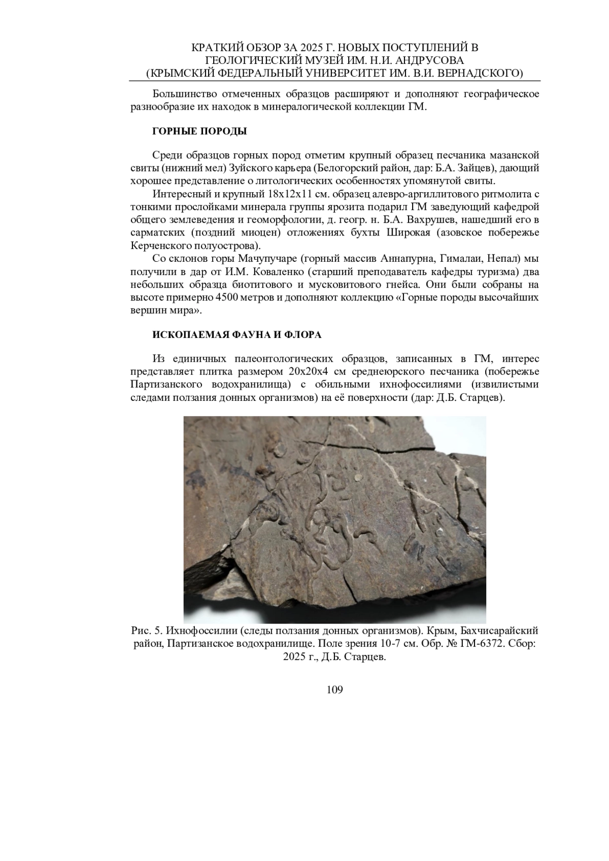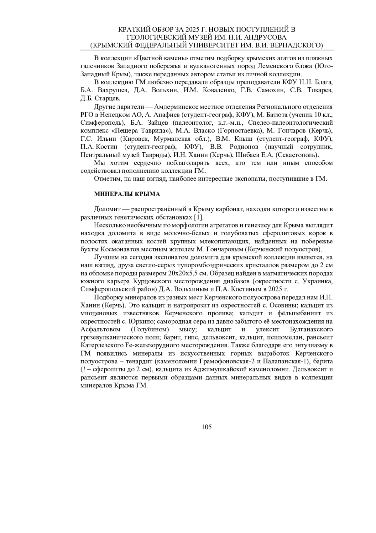 Статья: КРАТКИЙ ОБЗОР ЗА 2025 Г. НОВЫХ ПОСТУПЛЕНИЙ В ГЕОЛОГИЧЕСКИЙ МУЗЕЙ ИМ. Н. И. АНДРУСОВА (КРЫМСКИЙ ФЕДЕРАЛЬНЫЙ УНИВЕРСИТЕТ ИМ. В. И. ВЕРНАДСКОГО) (2025)
