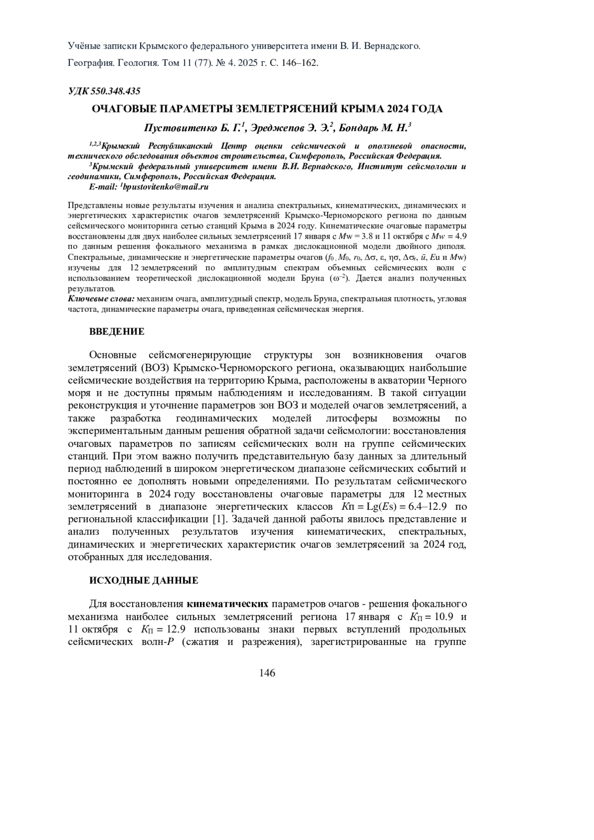 17. Пустовитенко Б.Г., Эреджепов Э.Э., Бондарь М.Н. Особенности очаговых параметров землетрясений Крыма 2023 года // Ученые записки Крымского Федерального Университета им В.И. Вернадского. География. Геология. 2024. Том 10 (76). №4. С.130-151.