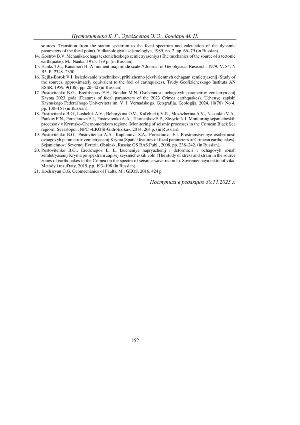 20. Пустовитенко Б.Г., Эреджепов Э.Э. Изучение напряжении и деформации в очаговых зонах землетрясений Крыма по спектрам записей сейсмических волн // Современная тектонофизика. Методы и результаты, 2019. С. 193-198.