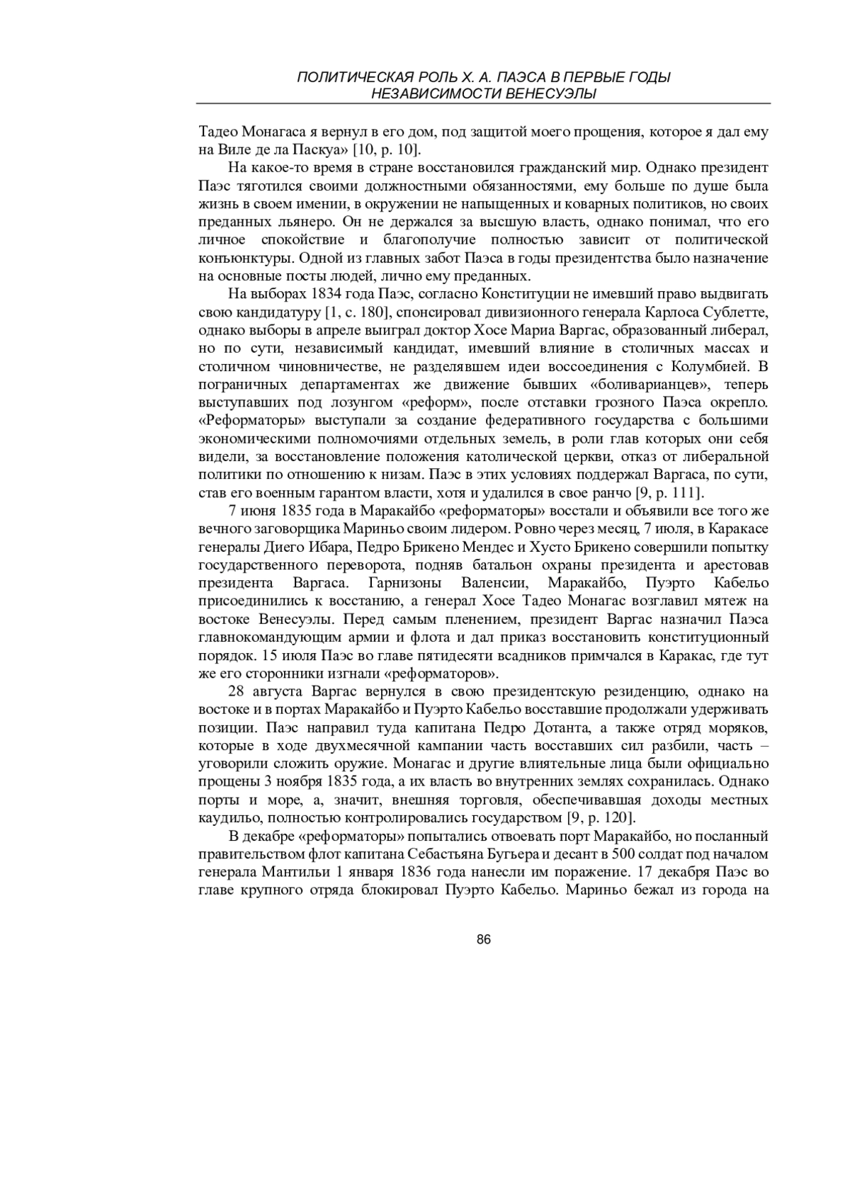 Исследуются первые годы независимости Венесуэлы после распада конфедерации Великая Колумбия и избрания президентом независимой Венесуэлы Х. А. Паэса. Изучены военно-политические конфликты в Венесуэле в первые годы ее существования и причины побед и поражений в них Х. А. Паэса. Противоречивая фигура Х. А. Паэса, негативно оценивавшаяся в советской исторической школе, тем не менее, играет значительную роль в процессе политического становления независимой Венесуэлы, и изучение того, как и почему именно Х. А. Паэс стал одним из военных вождей освободительного движения под руководством С. Боливара, а затем, порвав с С. Боливаром, оказался первым политическим лидером независимой Венесуэлы, является условием объективного взгляда на историю Венесуэлы, взгляда, свободного от идеологической критики, но также, свободного от апологетики, которая была присуща многим исследованиям, как на западе, так и в самой Венесуэле. Последовательное рассмотрение фактов биографии первого венесуэльского президента дает базисную фатологию для научного исторического анализа событий начального этапа истории этой страны.