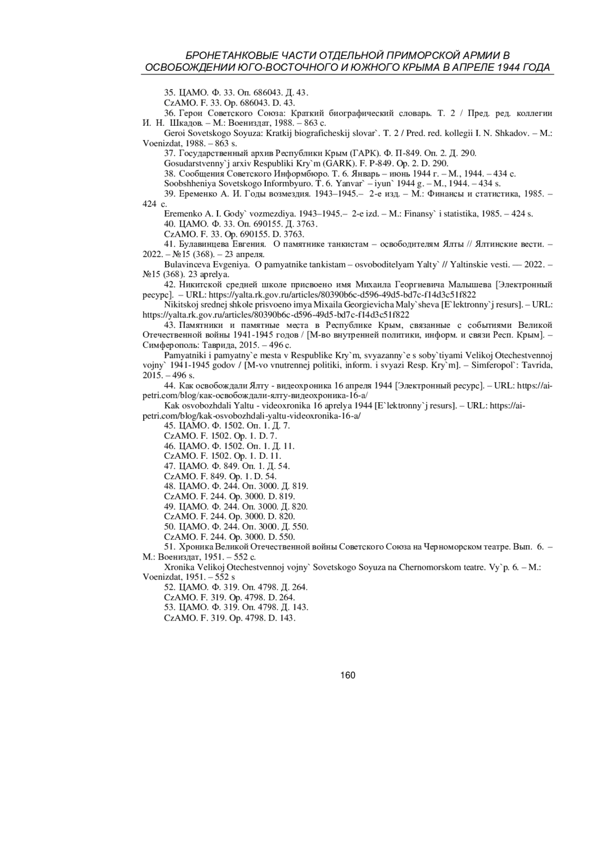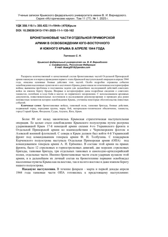 54. Ткаченко С. Н. Советское военное искусство в Крымской стратегической наступательной операции (апрель - май 1944 г.) // Крым, 1944: Весна освобождения / авт.-сост. С. Н. Ткаченко. - М.: Вече, 2014. - С. 484-501.