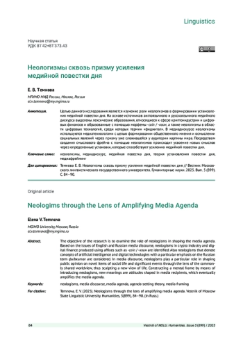 Целью данного исследования является изучение роли неологизмов в формировании установления медийной повестки дня. На основе источников англоязычного и русскоязычного медийного дискурса выделены лексические образования, относящиеся к сфере криптоиндустрии и цифровых финансов и образованные с помощью морфемы -coin / -коин, а также неологизмы в области цифровых технологий, среди которых термин «фиджитал». В медиадискурсе неологизмы используются медиатехнологами с целью формировании общественного мнения и осмыслении социальных явлений через призму уже сложившейся у аудитории картины мира. Посредством создания смыслового фрейма с помощью неологизмов происходит усвоение новых смыслов через определенные установки, которые способствуют усилению медийной повестки дня.