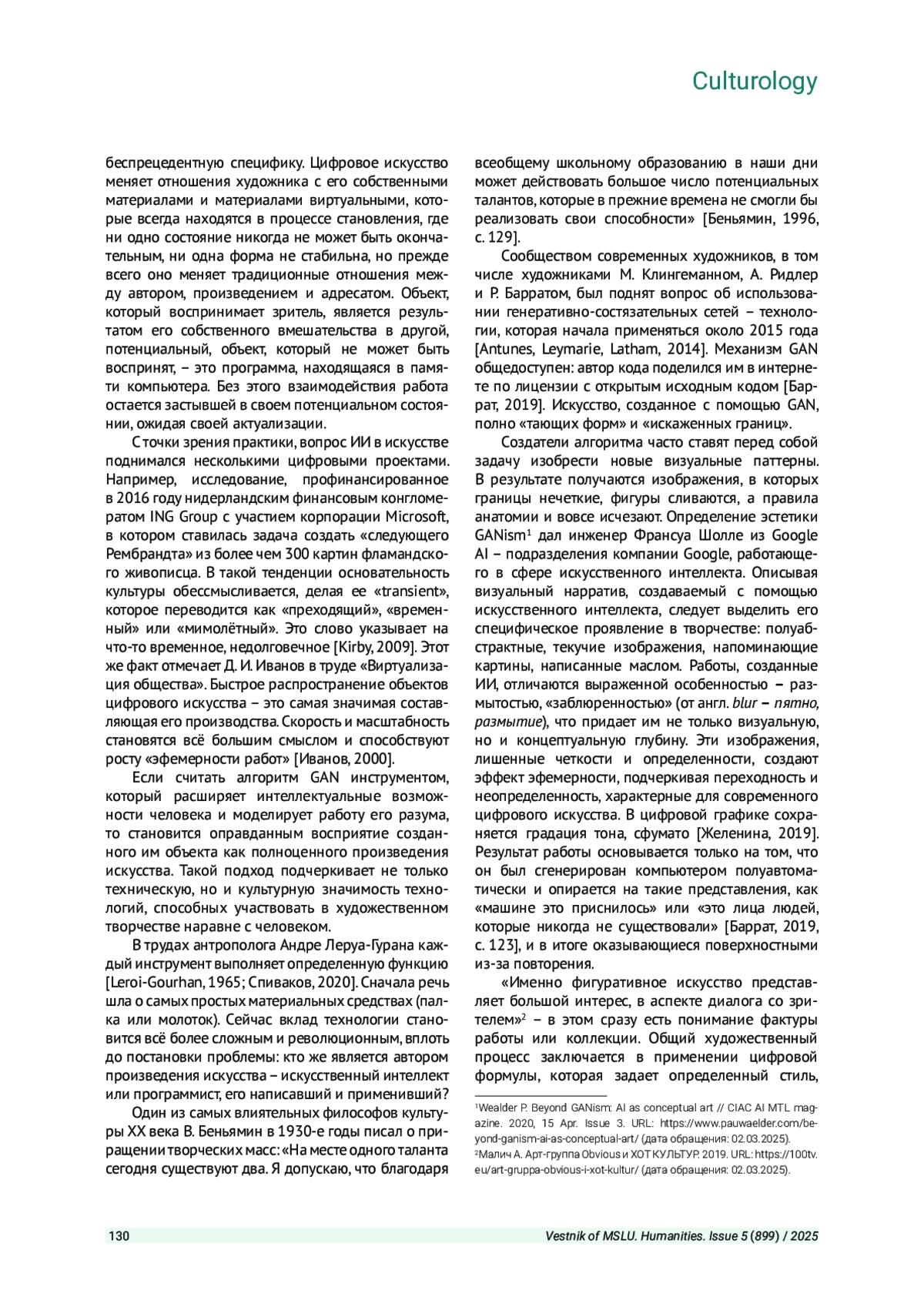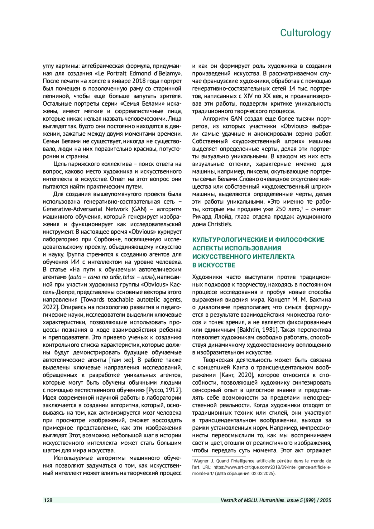 Активное накопление цифровых артефактов в современном искусстве способствует развитию творческого и исследовательского потенциала. Особенно это заметно в контексте интеграции искусственного интеллекта и художественного процесса. С целью изучения влияния новых технологий на традиционные художественные практики и концепции авторства проведен анализ работ французской художественной группы «Obvious Collective», использующей инновационные инструменты для создания своих произведений. Применение культурологического и философского анализа творческого направления позволило глубже понять концептуальные проблемы, возникающие на стыке технологий и искусства. Результаты исследования показывают, что использование искусственного интеллекта не только меняет роль художника, но и ставит под сомнение традиционные представления об оригинальности и авторстве произведений искусства.
