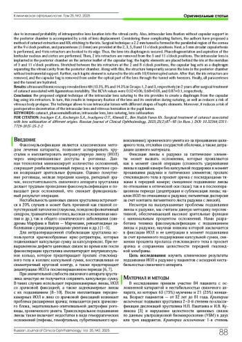 14. Zhang Y., He F., Jiang J. et al. Modified technique for intrascleral fixation of posterior chamber intraocular lens without scleral flaps. J Cataract Refract Surg. 2017;43(2): 162-166. DOI: 10.1016/j.jcrs.2016.10.029