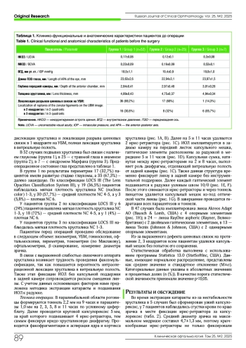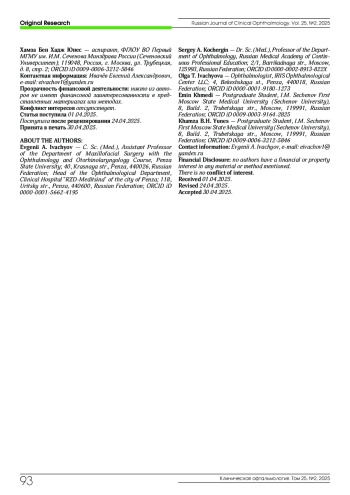 8. Малюгин Б.Э., Пантелеев Е.Н., Хапаева Л.Л., Савенков С.Г. Результаты смешанной цилиокапсулярной фиксации трехчастной ИОЛ при факоэмульсификации у пациентов с несостоятельностью связочного аппарата хрусталика. Офтальмохирургия. 2023;1:6-17. DOI: 10.25276/0235-4160-2023-1-6-17