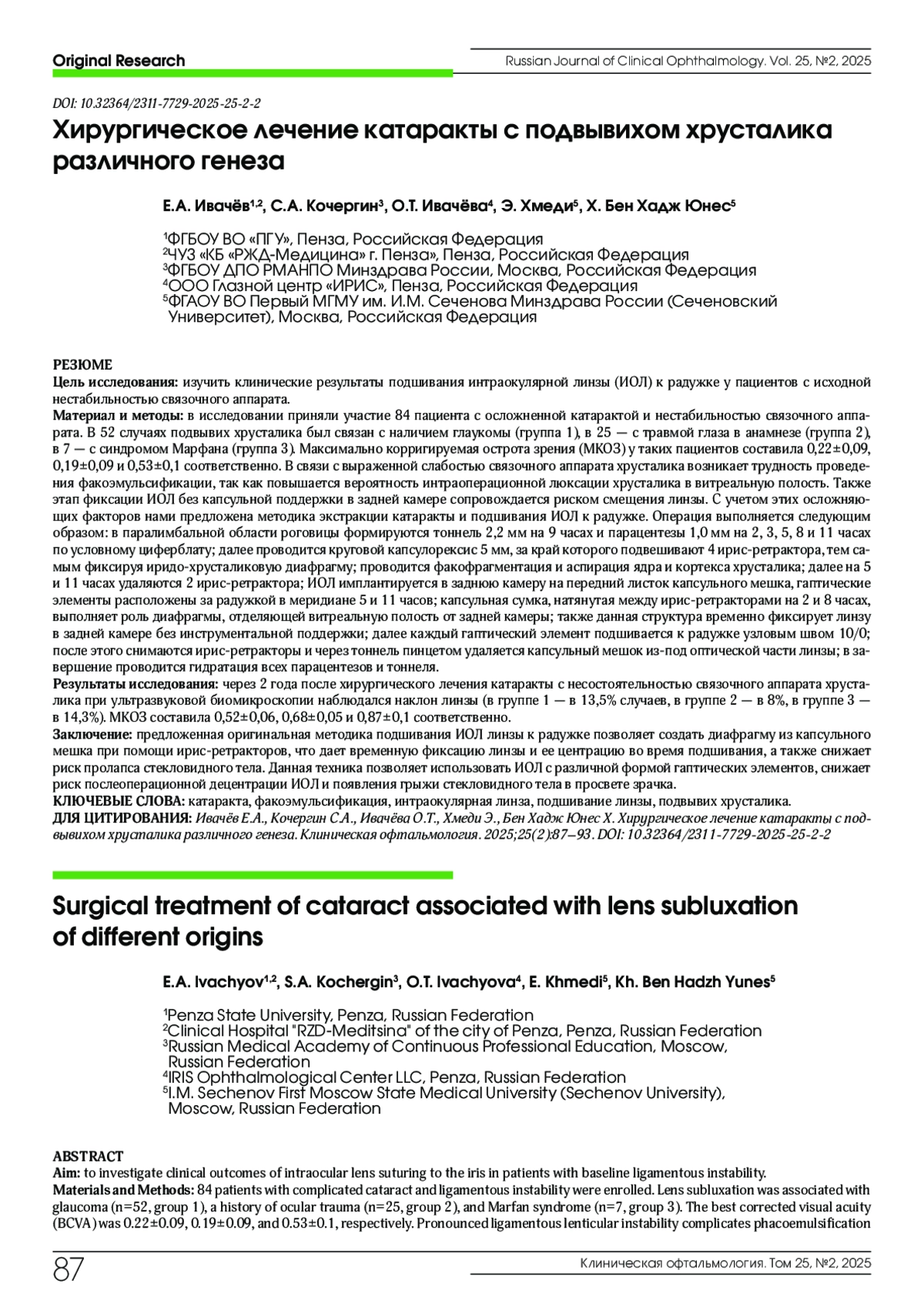 9. Пирогова Е.С., Фабрикантов О.Л., Николашин С.И. Оптимизация технологии факоэмульсификации при осложненной катаракте с подвывихом хрусталика. Вестник офтальмологии. 2021;137(5):78-85. DOI: 10.17116/oftalma202113705178