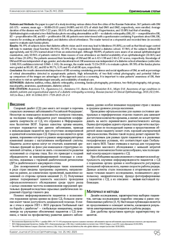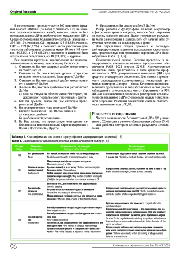 8. Abdulaal A.E., Alobaid O.M., Alotaibi A.G. et al. Diabetic patients’ awareness of diabetic retinopathy symptoms and complications. J Family Med Prim Care. 2019;8(1):49-53. DOI: 10.4103/jfmpc.jfmpc_349_18